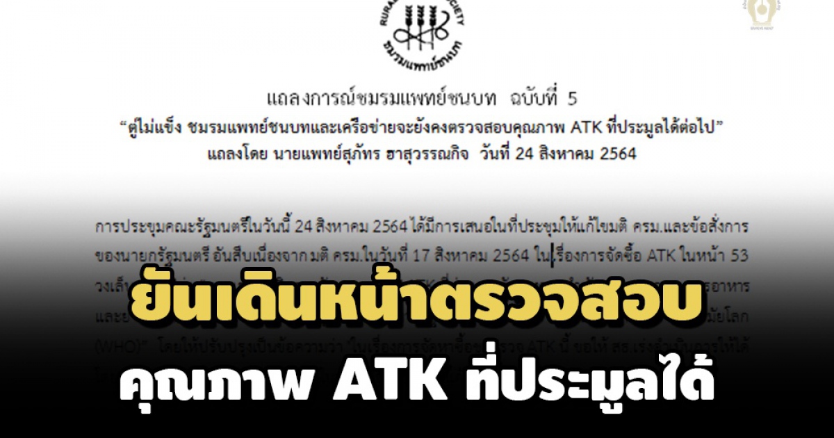 ผู้สื่อข่าวรายงานว่า เมื่อวันที่ 22 ส.ค.2564 ชมรมแพทย์ชนบท โพสต์ข้อความผ่านเฟซบุ๊ก ชมรมแพทย์ชนบท ออกแถลงการณ์ ฉบับที่ 5 เรื่อง ชมรมแพทย์ชนบทและเครือข่ายจะยังคงตรวจสอบคุณภาพ ATK ที่ประมูลได้ต่อไป โดยระบุว่า การประชุมคณะรัฐมนตรีในวันนี้ 24 ส.ค.2564 ได้มีการเสนอในที่ประชุมให้แก้ไขมติ ครม.และข้อสั่งการของนายกรัฐมนตรี สืบเนื่องจาก มติ ครม.ในวันที่ 17 ส.ค.2564 ในเรื่องการจัดซื้อ ATK ในหน้า 53 วงเล็บ 6 ระบุว่า 'การเร่งดำเนินการจัดหาชุดตรวจ ATK ที่ผ่านการรับรองจากสำนักงานคณะกรรมการอาหารและยา (อย.) มีจำหน่ายในไทย มีคุณภาพตามมาตรฐานสากล ได้รับการรับรองจากองค์การอนามัยโลก (WHO)' โดยให้ปรับปรุงเป็นข้อความว่า 'ในเรื่องการจัดหาซื้อชุดตรวจ ATK นี้ ขอให้ สธ.เร่งดำเนินการให้ได้โดยเร็ว หากมีปัญหาความขัดแย้งอยู่ในปัจจุบัน ขอให้เร่งแก้ไขปัญหาให้ดีที่สุด'