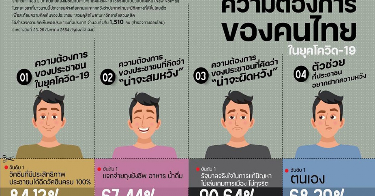 สวนดุสิตโพล มหาวิทยาลัยสวนดุสิต สำรวจความคิดเห็นของประชาชนต่อกรณี ความต้องการของคนไทย ในยุคโควิด-19 กลุ่มตัวอย่าง 1,510 คน ระหว่างวันที่ 23-26 สิงหาคม 2564 พบว่า ความต้องการอันดับ 1 ของประชาชน ณ วันนี้ คือ การมีวัคซีนที่มีประสิทธิภาพ ประชาชนได้ฉีดวัคซีนครบทุกคน ร้อยละ 84.12 โดยความหวังที่คิดว่าน่าจะสมหวัง คือ การได้รับถุงยังชีพ อาหาร น้ำดื่ม ร้อยละ 67.44 ความหวังที่คาดว่าน่าจะผิดหวัง คือ รัฐบาลจริงใจ ในการแก้ปัญหา ร้อยละ 90.64 ตัวช่วยที่ประชาชนฝากความหวังมากที่สุด คือ ตนเอง ร้อยละ 68.39