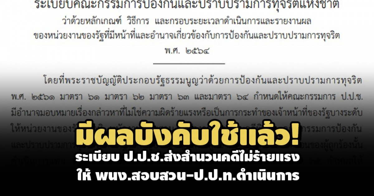 มีผลบังคับใช้แล้ว! ระเบียบ ป.ป.ช.ส่งสำนวนคดีไม่ร้ายแรงให้ พนง.สอบสวน-ป.ป.ท.-ผู้บังคับบัญชา ดำเนินการ หากมีความเห็นต้องรายงานกลับมาใน 30 วัน แต่ถ้าไม่เห็นด้วย-ส่อไม่เป็นธรรม มีสิทธิเรียกสำนวนคืนมาไต่สวนเองได้