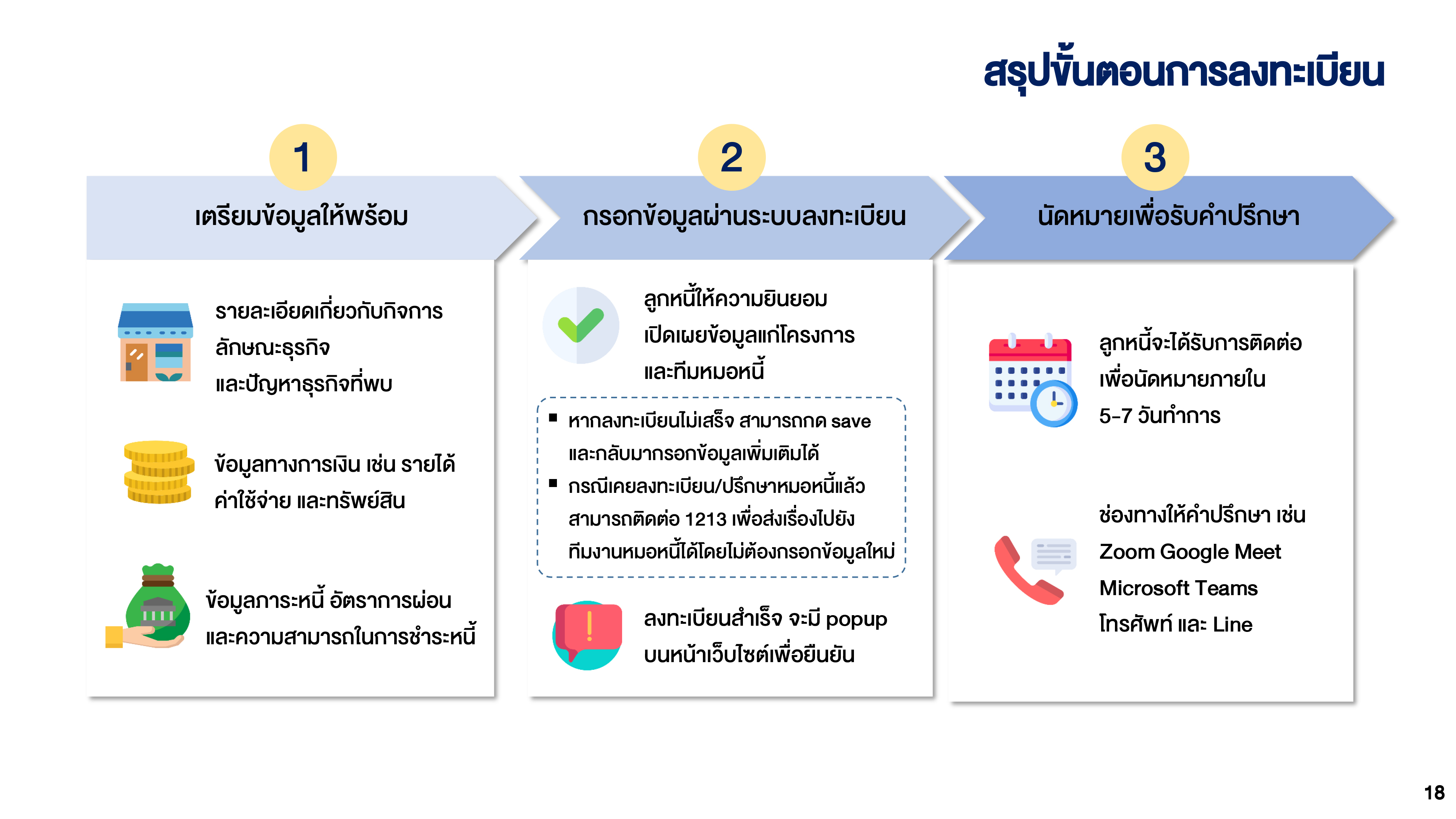 “ลูกหนี้รายย่อยและผู้ประกอบการ SMEs จะได้รับความรู้และความเข้าใจในการแก้ไขปัญหาหนี้ ได้แก่ วิธีการเตรียมข้อมูลสำหรับเจรจาปรับโครงสร้างหนี้ อาทิ การจัดทำแผนธุรกิจ ข้อมูลทรัพย์สินและหนี้สิน ข้อมูลรายรับรายจ่าย เพื่อใช้ในการวิเคราะห์ความสามารถในการชำระหนี้ รวมทั้งแนวทางการพูดคุยกับเจ้าหนี้ ตลอดจนข้อมูลมาตรการช่วยเหลือของสถาบันการเงินต่างๆที่เหมาะสมกับตนเอง” นางธัญญนิตย์ กล่าว