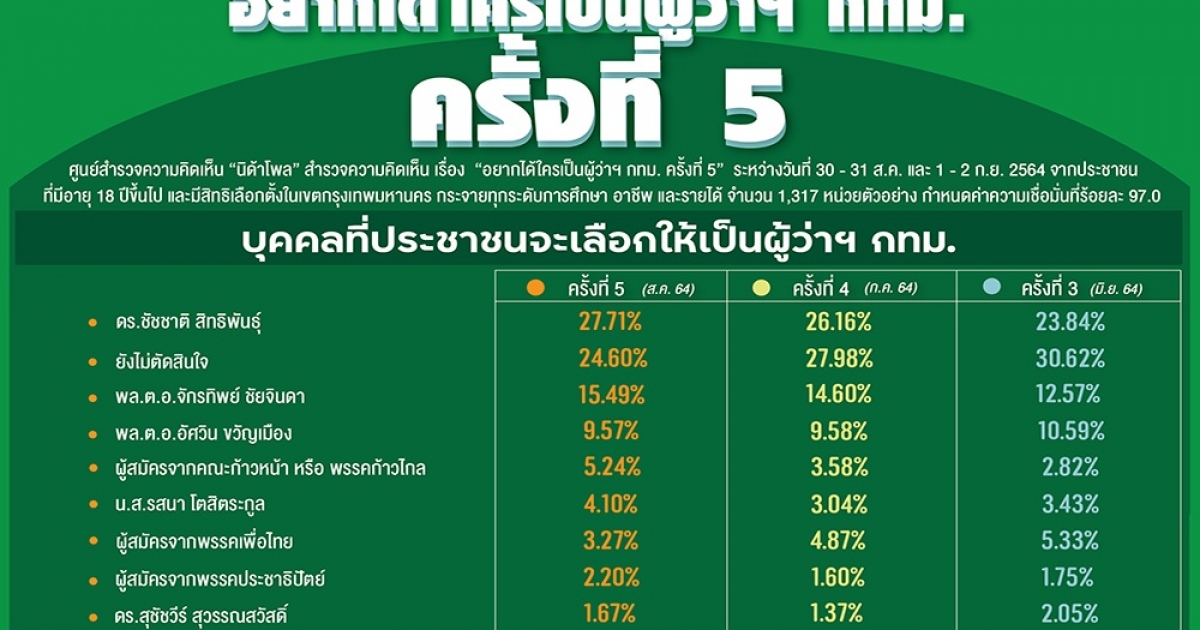ศูนย์สำรวจความคิดเห็น “นิด้าโพล” สถาบันบัณฑิตพัฒนบริหารศาสตร์ (นิด้า) เปิดเผยผลสำรวจของประชาชน เรื่อง “อยากได้ใคร เป็นผู้ว่าฯ กทม. ครั้งที่ 5” ทำการสำรวจระหว่างวันที่ 30 – 31 สิงหาคม และ 1 – 2 กันยายน 2564 จากประชาชนที่มีอายุ 18 ปีขึ้นไป และมีสิทธิเลือกตั้งในกรุงเทพมหานคร กระจายทุกระดับการศึกษา อาชีพ และรายได้ รวมทั้งสิ้น จำนวน 1,317 หน่วยตัวอย่าง เกี่ยวกับประชาชนอยากได้ใครเป็นผู้ว่าฯ กทม. ครั้งที่ 5 การสำรวจอาศัยการสุ่มตัวอย่างโดยใช้ความน่าจะเป็นจากบัญชีรายชื่อฐานข้อมูลตัวอย่างหลัก (Master Sample) ของ “นิด้าโพล” สุ่มตัวอย่างด้วยวิธีแบบง่าย (Simple Random Sampling) เก็บข้อมูลด้วยวิธีการสัมภาษณ์ทางโทรศัพท์ โดยกำหนดค่าความเชื่อมั่นที่ ร้อยละ 97.0