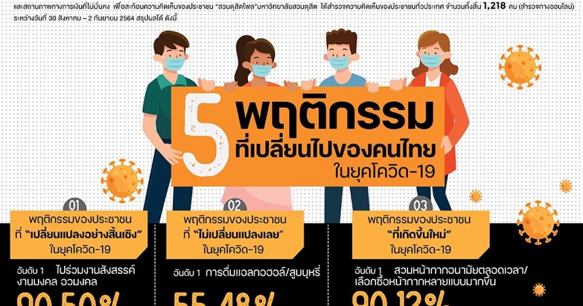 สวนดุสิตโพล มหาวิทยาลัยสวนดุสิต สำรวจความคิดเห็นของประชาชนต่อกรณี “พฤติกรรมที่เปลี่ยนไปของคนไทยในยุคโควิด-19” กลุ่มตัวอย่างจำนวน 1,218 คน ระหว่างวันที่ 30 สิงหาคม – 2 กันยายน 2564 พบว่า พฤติกรรม ที่เปลี่ยนไปอย่างสิ้นเชิงมากที่สุด คือ การไปร่วมงานสังสรรค์ต่าง ๆ ร้อยละ 90.50 รองลงมาคือ การเดินทางท่องเที่ยว ร้อยละ 89.50 ส่วนพฤติกรรมที่ไม่เปลี่ยนแปลงเลย คือ การดื่มแอลกอฮอล์/สูบบุหรี่ ร้อยละ 55.48 โดยพฤติกรรมที่เกิดขึ้นใหม่ คือ การสวมหน้ากากอนามัยตลอดเวลา การเลือกซื้อหน้ากากหลากหลายแบบมากขึ้น ร้อยละ 90.12 ภาพรวมประชาชนค่อนข้างพึงพอใจต่อพฤติกรรมที่เปลี่ยนแปลงไป ร้อยละ 35.48 และไม่ค่อยพึงพอใจ ร้อยละ 27.79