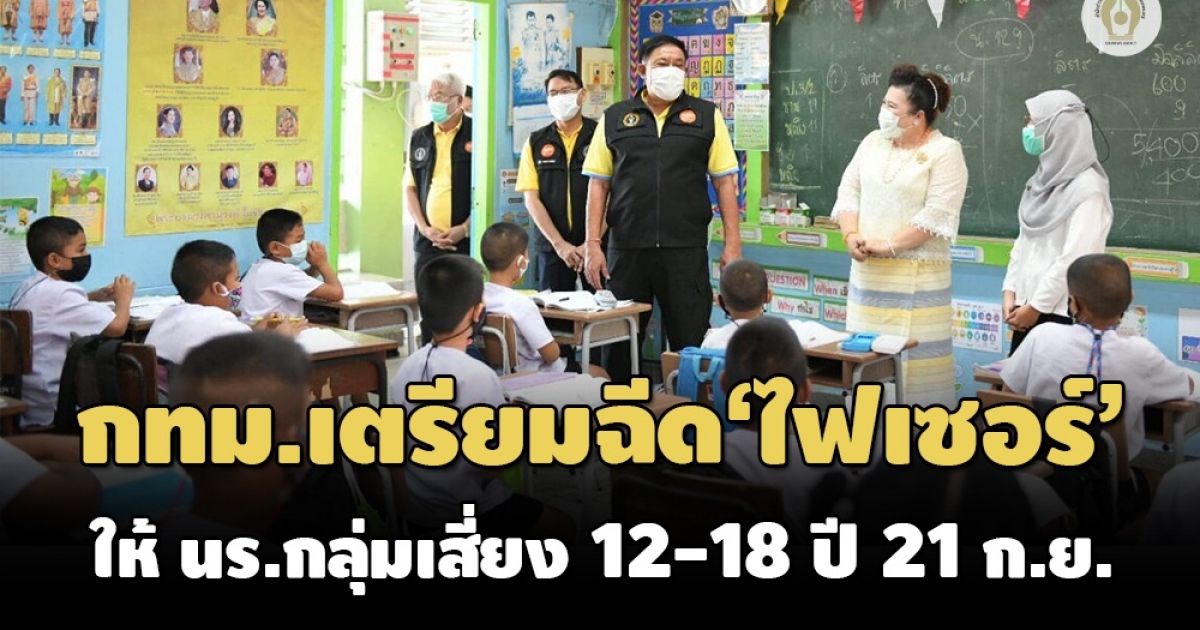 กทม.เตรียมฉีด'ไฟเซอร์'เข็มแรก ให้นักเรียนกลุ่มเสี่ยงอายุ 12-18 ปี สังกัด กทม.ทั้ง 437 โรงงาน เริ่ม 21 ก.ย.นี้ โดยให้ลงทะเบียนแจ้งความประสงค์ผ่าน QR Code ถึง 8 ก.ย.2564