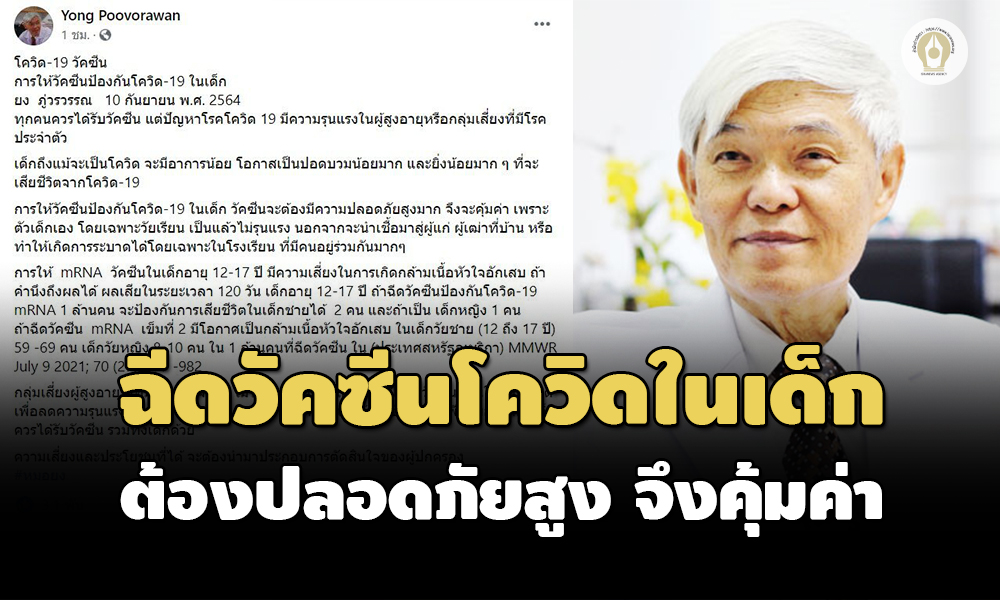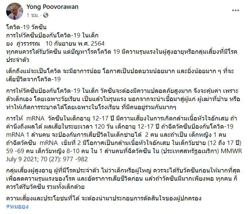 ผู้สื่อข่าวรายงานว่า เมื่อวันที่ 10 ก.ย.2564 ศ.นพ.ยง ภู่วรวรรณ หัวหน้าศูนย์เชี่ยวชาญเฉพาะทางด้านไวรัสวิทยาคลินิก คณะแพทยศาสตร์ จุฬาลงกรณ์มหาวิทยาลัย โพสต์เฟซบุ๊ก Yong Poovorawan ให้ความเห็นเกี่ยวกับการให้วัคซีนโควิดในเด็ก ระบุว่า ทุกคนควรได้รับวัคซีน แต่ปัญหาโรคโควิดมีความรุนแรงในผู้สูงอายุหรือกลุ่มเสี่ยงที่มีโรคประจำตัว