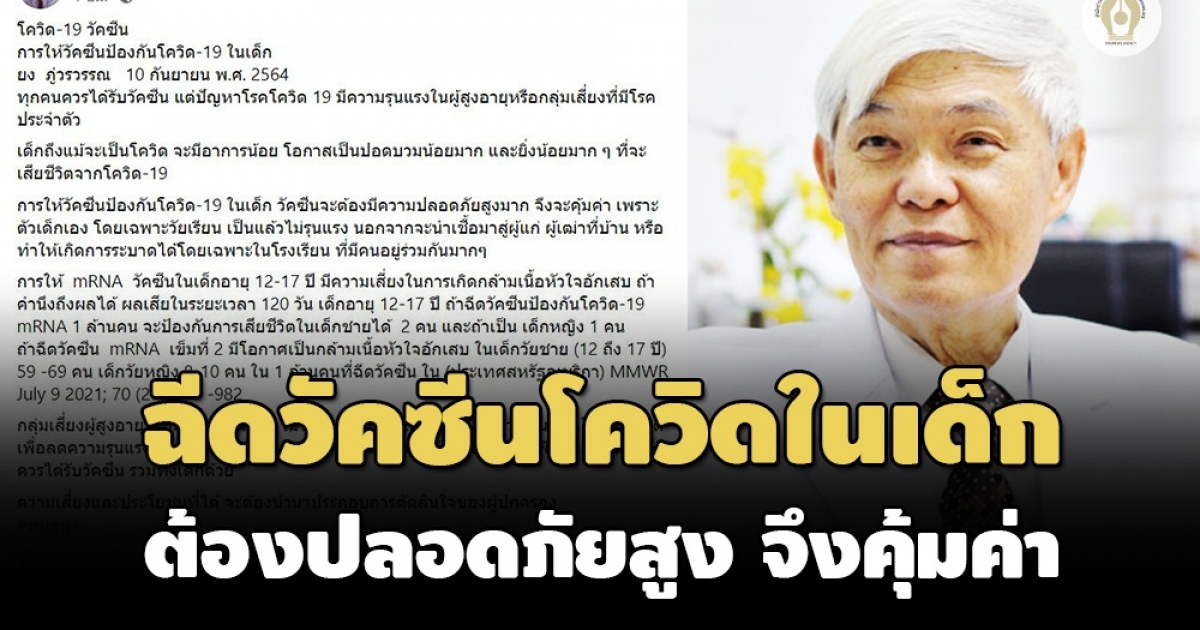 'หมอยง'ให้คำแนะนำการฉีดวัคซีนโควิดในเด็ก ต้องปลอดภัยสูงมาก จึงจะคุ้มค่า ชี้ mRNA มีความเสี่ยงเกิดกล้ามเนื้อหัวใจอักเสบ ความเสี่ยงและประโยชนที่ได้ จะต้องนำมาประกอบการตัดสินใจของผู้ปกครอง