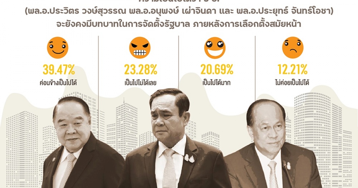 ท้ายที่สุดเมื่อถามถึงความคิดเห็นของประชาชนต่อความเป็นไปได้ว่า 3 ป. (พล.อ.ประวิตร วงษ์สุวรรณ พล.อ.อนุพงษ์ เผ่าจินดา และพล.อ.ประยุทธ์ จันทร์โอชา) จะยังคงมีบทบาทในการจัดตั้งรัฐบาล ภายหลังการเลือกตั้งสมัยหน้า พบว่า ส่วนใหญ่ ร้อยละ 39.47 ระบุว่า ค่อนข้างเป็นไปได้ รองลงมา ร้อยละ 23.28 ระบุว่า เป็นไปไม่ได้เลย ร้อยละ 20.69 ระบุว่า เป็นไปได้มาก ร้อยละ 12.21 ระบุว่า ไม่ค่อยเป็นไปได้ และร้อยละ 4.35 ระบุว่า ไม่ทราบ/ไม่ตอบ/ไม่สนใจ
