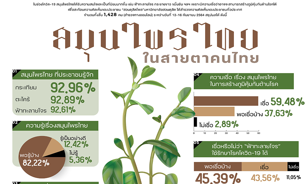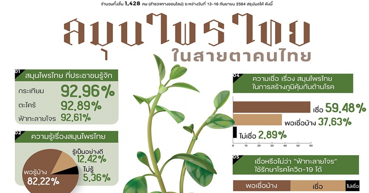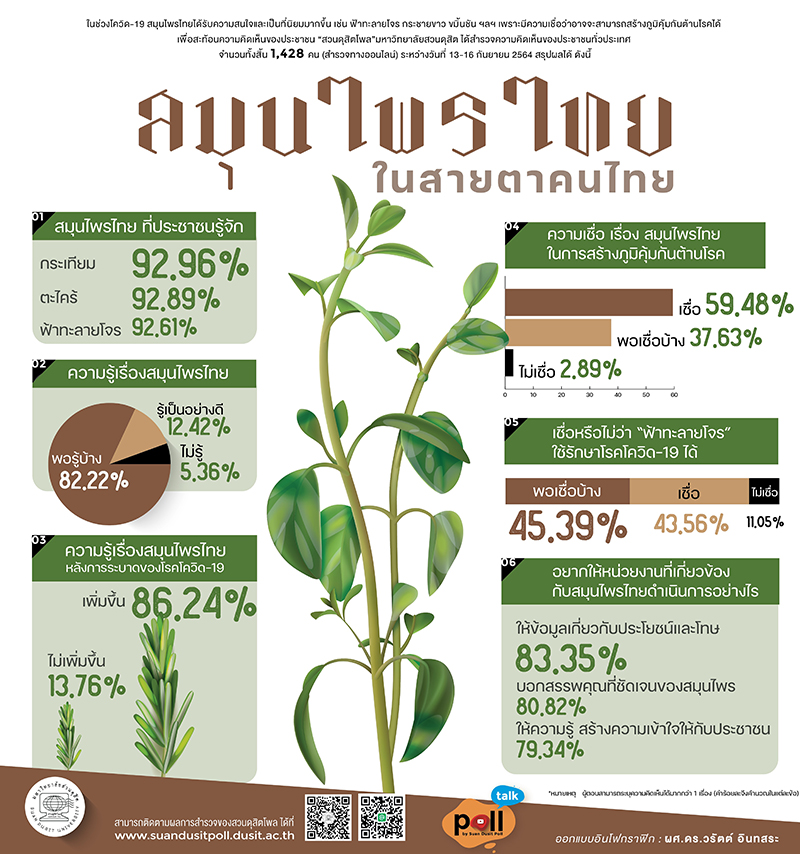 สวนดุสิตโพล มหาวิทยาลัยสวนดุสิต สำรวจความคิดเห็นของประชาชนต่อกรณี “สมุนไพรไทย” ในสายตาคนไทย กลุ่มตัวอย่างจำนวน 1,428 คน สำรวจระหว่างวันที่ 13-16 กันยายน 2564 พบว่า สมุนไพรที่ส่วนใหญ่รู้จัก คือ กระเทียม ร้อยละ 92.96 รองลงมาคือ ตะไคร้ ร้อยละ 92.89 และฟ้าทะลายโจร ร้อยละ 92.61 โดยประชาชนพอจะมีความรู้เรื่องสมุนไพรไทยบ้าง ร้อยะ 82.22 จากการระบาดของโรคโควิด-19 ทำให้มีความรู้เรื่องสมุนไพรเพิ่มขึ้น ร้อยละ 86.24 และเชื่อว่าสมุนไพรสร้างภูมิคุ้มกันต้านโรคได้ ร้อยละ 59.48 ทั้งนี้ร้อยละ 45.39 พอเชื่อบ้างว่าฟ้าทะลายโจรใช้รักษาโรค โควิด-19 ได้ สิ่งที่อยากให้หน่วยงานที่เกี่ยวข้องดำเนินการ คือ ให้ข้อมูลเกี่ยวกับประโยชน์และโทษ ร้อยละ 83.35 และบอกสรรพคุณที่ชัดเจนของสมุนไพร ร้อยละ 80.82