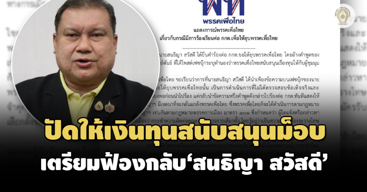 ผู้สื่อข่าวรายงานว่า เมื่อวันที่ 24 ก.ย.2564 พรรคเพื่อไทย ออกแถลงการณ์ เกี่ยวกับกรณีมีการร้องเรียนต่อสำนักงานคณะกรรมการการเลือกตั้ง (กกต.) เพื่อให้ยุบพรรคเพื่อไทย ระบุว่า ตามที่ นายสนธิญา สวัสดี ได้ยื่นคำร้องต่อ กกต.ขอให้ยุบพรรคเพื่อไทย โดยอ้างคำพูดของนายไชยอมร แก้ววิบูลย์พันธุ์ หรือ แอมมี่ เดอะบอททอมบลูส์ ที่ได้โพสต์เฟซบุ๊กระบุทำนองว่าพรรคเพื่อไทยสนับสนุนเรื่องทุนให้กับผู้ชุมนุมทางการเมือง นั้น
