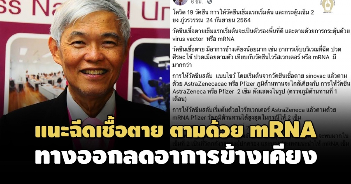 ผู้สื่อข่าวรายงานว่า เมื่อวันที่ 24 ก.ย.2564 ศ.นพ.ยง ภู่วรวรรณ หัวหน้าศูนย์เชี่ยวชาญเฉพาะทางด้านไวรัสวิทยาคลินิก ภาควิชากุมารเวชศาสตร์ คณะแพทยศาสตร์ จุฬาลงกรณ์มหาวิทยาลัย โพสต์ข้อความผ่านเฟซบุ๊ก Yong Poovorawan กล่าวถึงการให้วัคซีนสลับแบบไขว้ว่า วัคซีนเชื้อตายเข็มแรกเริ่มต้นจะเป็นตัวรองพื้นที่ดี และตามด้วยการกระตุ้นด้วย virus vector หรือ mRNA