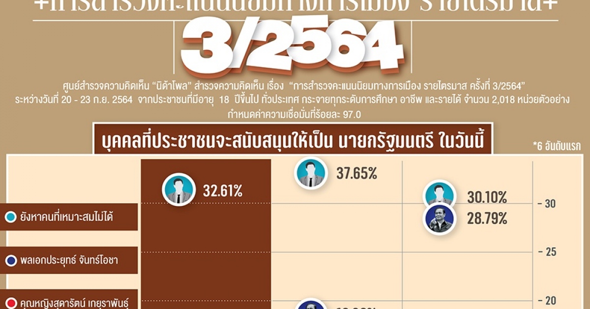 ศูนย์สำรวจความคิดเห็น “นิด้าโพล” สถาบันบัณฑิตพัฒนบริหารศาสตร์ (นิด้า) เปิดเผยผลสำรวจของประชาชน เรื่อง “การสำรวจคะแนนนิยมทางการเมือง รายไตรมาส ครั้งที่ 3/2564” ทำการสำรวจระหว่างวันที่ 20 – 23 กันยายน 2564 จากประชาชนที่มีอายุ 18 ปีขึ้นไป กระจายทุกภูมิภาค ระดับการศึกษา และอาชีพทั่วประเทศ รวมทั้งสิ้น จำนวน 2,018 หน่วยตัวอย่าง เกี่ยวกับการสำรวจคะแนนนิยมทางการเมือง การสำรวจอาศัย การสุ่มตัวอย่างโดยใช้ความน่าจะเป็นจากบัญชีรายชื่อฐานข้อมูลตัวอย่างหลัก (Master Sample) ของ “นิด้าโพล” สุ่มตัวอย่างด้วยวิธีแบบง่าย (Simple Random Sampling) เก็บข้อมูลด้วยวิธีการสัมภาษณ์ทางโทรศัพท์ โดยกำหนดค่าความเชื่อมั่นที่ร้อยละ 97.0