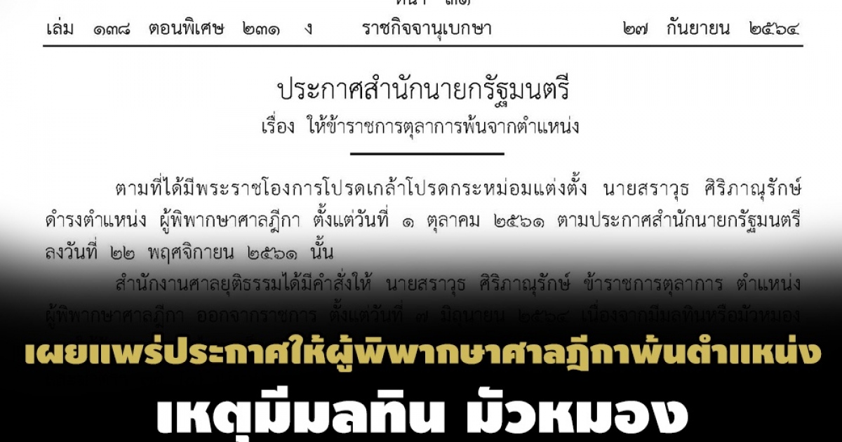 เผยแพร่ประกาศสำนักนายกฯ มีพระบรมราชโองการโปรดเกล้าฯ ให้ข้าราชการตุลาการ พ้นตำแหน่งผู้พิพากษาศาลฎีกา เหตุสำนักงานศาลยุติธรรมสั่งให้ออกจากราชการ มีมลทิน มัวหมอง