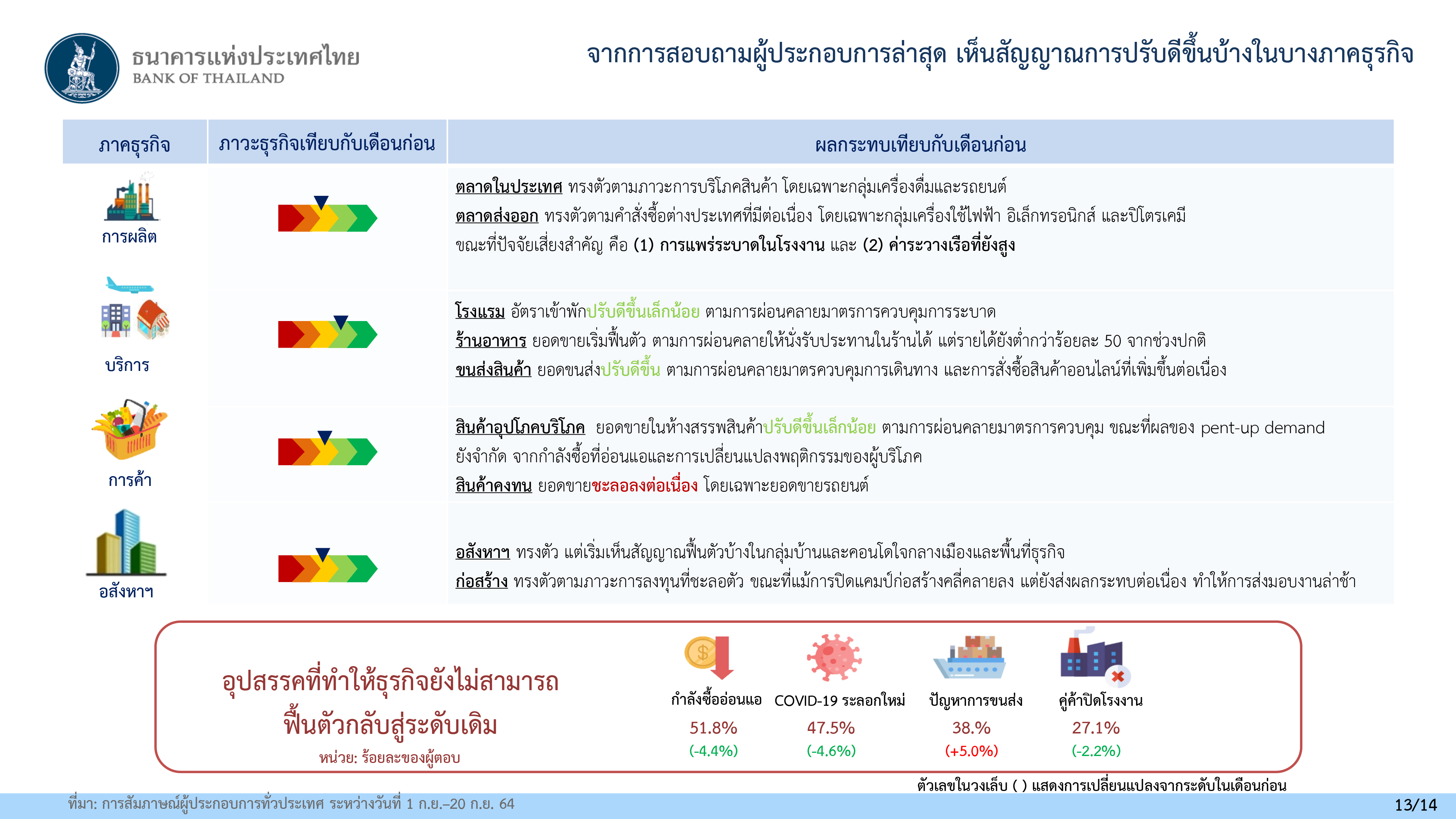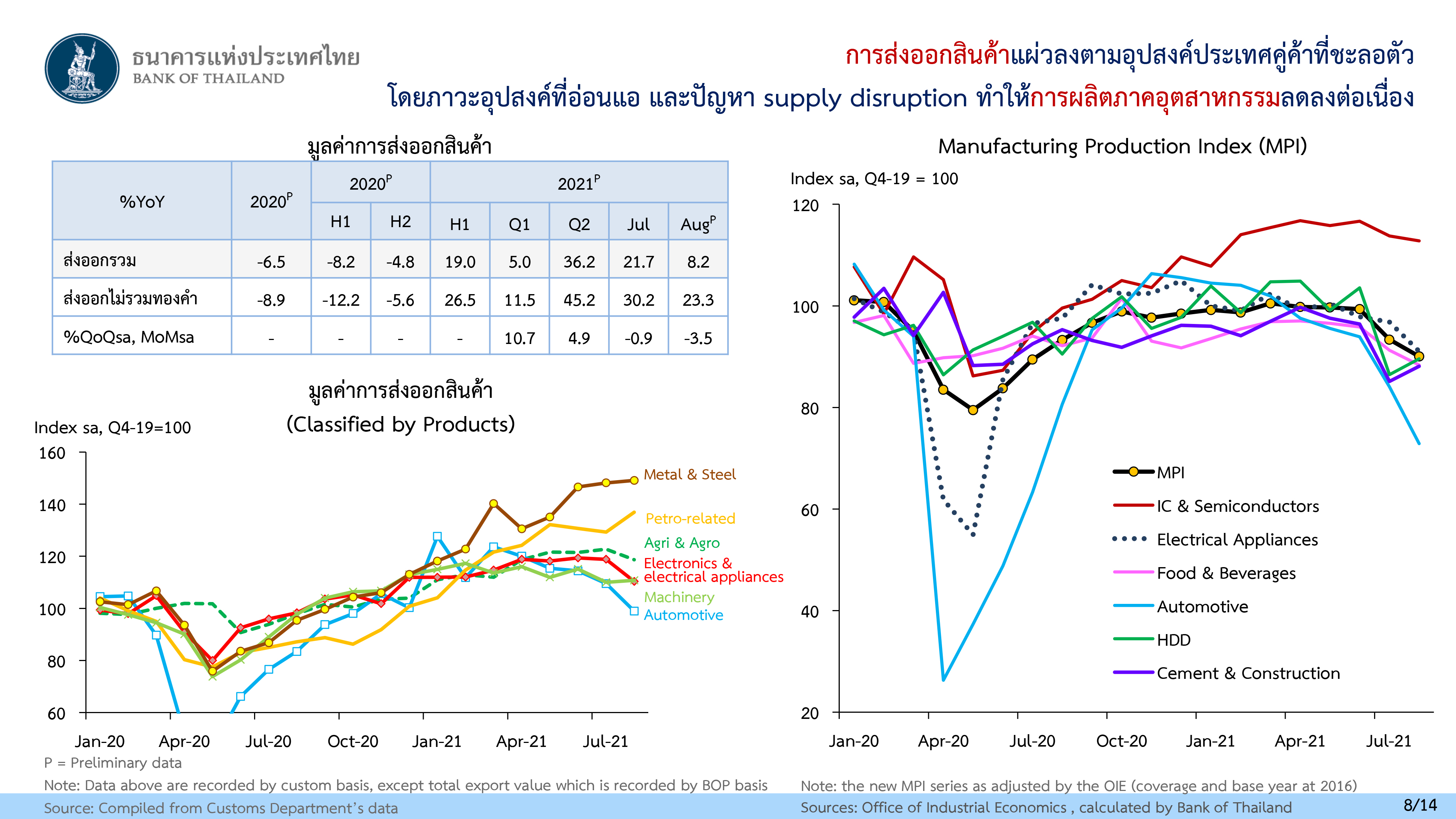 ขณะที่การส่งออกสินค้าไทยลดลงในหลายหมวด ตามอุปสงค์ประเทศคู่ค้าที่ชะลอตัว หลังการระบาดโควิด-19 ในต่างประเทศที่รุนแรงขึ้น รวมทั้งภาคการผลิตและการส่งออกยังคงได้รับผลกระทบจากปัญหา supply disruption จำนวนนักท่องเที่ยวต่างชาติลดลงจากการแพร่ระบาดที่รุนแรงขึ้น ด้านตลาดแรงงานเปราะบางมากขึ้น อย่างไรก็ดี การใช้จ่ายภาครัฐยังขยายตัวทั้งรายจ่ายเงินโอนและรายจ่ายประจำ และดุลบัญชีเดินสะพัดขาดดุลมากกว่าเดือนก่อน