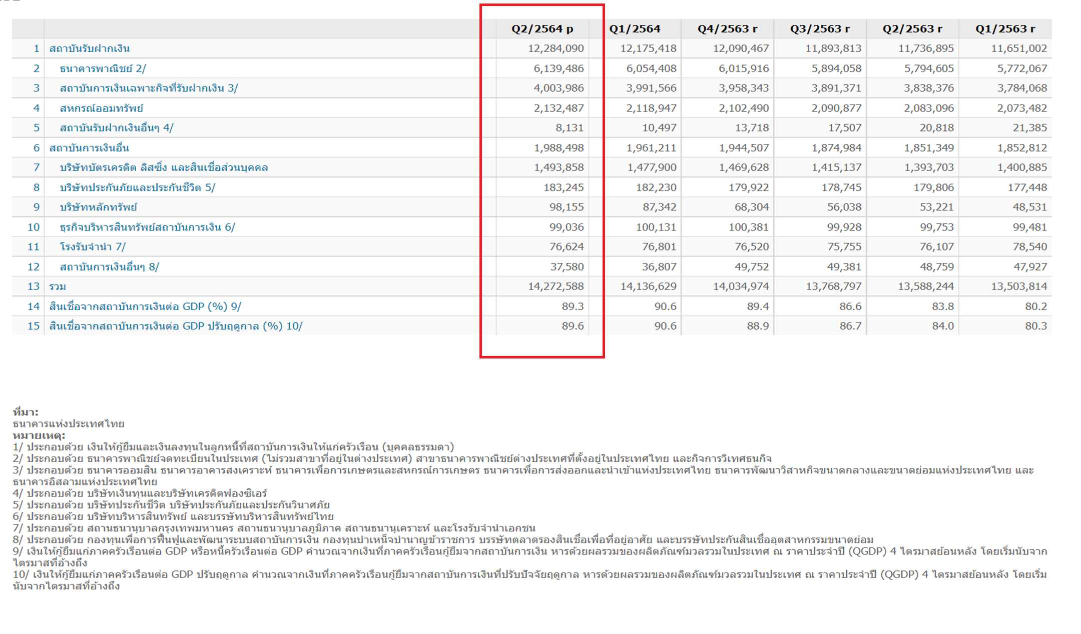 สำนักข่าวอิศรา (www.isranews.org) รายงานว่า เมื่อวันที่ 30 ก.ย.ที่ผ่านมา ธนาคารแห่งประเทศไทย (ธปท.) เปิดเผยสถิติเงินให้กู้ยืมแก่ภาคครัวเรือนหรือหนี้สินครัวเรือน พบว่า ณ สิ้นไตรมาส 2/2564 หนี้สินครัวเรือนไทยในภาพรวมมีจำนวน 14.27 ล้านล้านบาท หรือคิดเป็นสัดส่วน 89.3% ต่อจีดีพี เทียบกับไตรมาส 1/2564 ที่หนี้สินครัวเรือนมีจำนวน 14.13 ล้านล้านบาท หรือคิดเป็นสัดส่วน 90.6% ต่อจีดีพี
