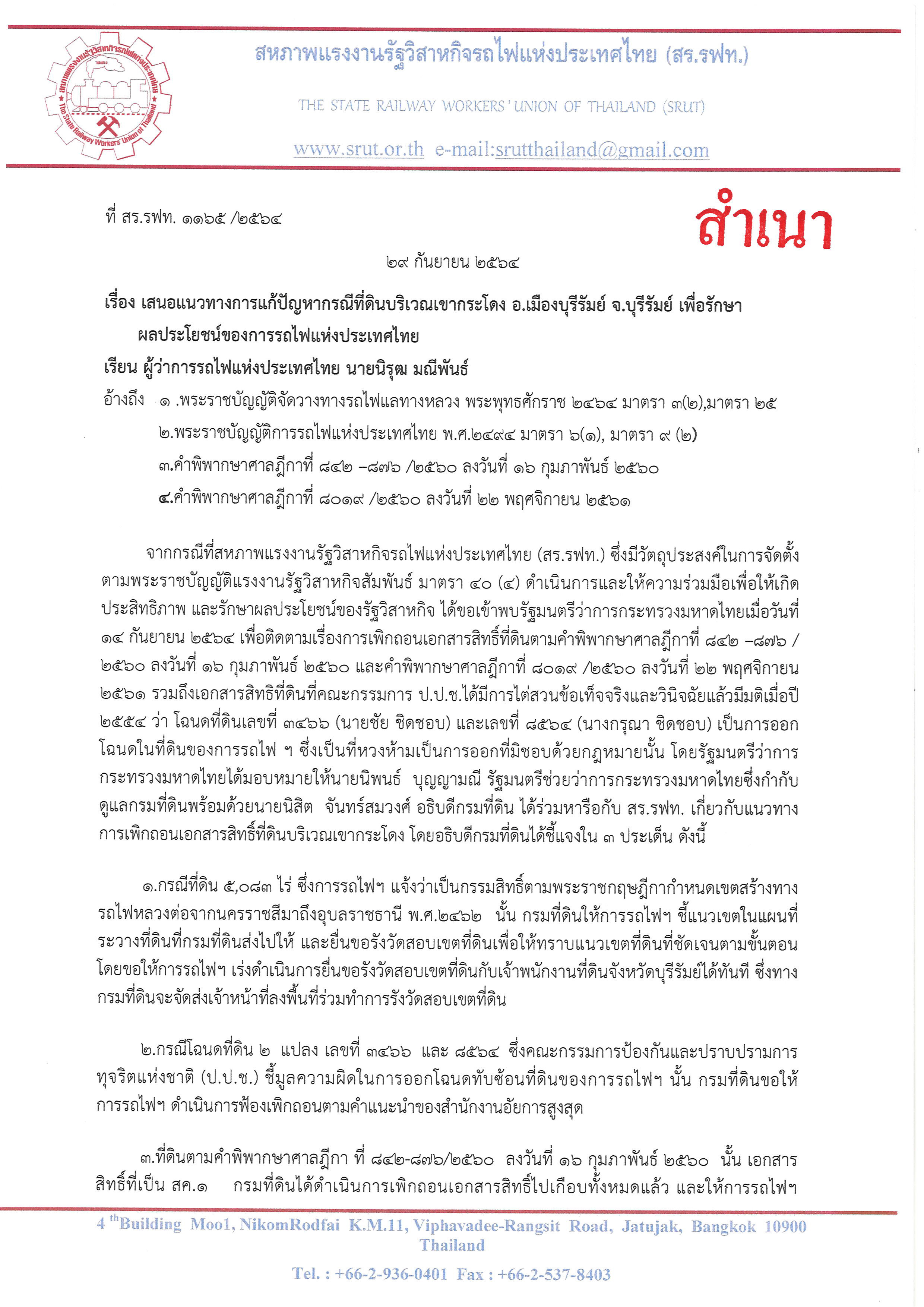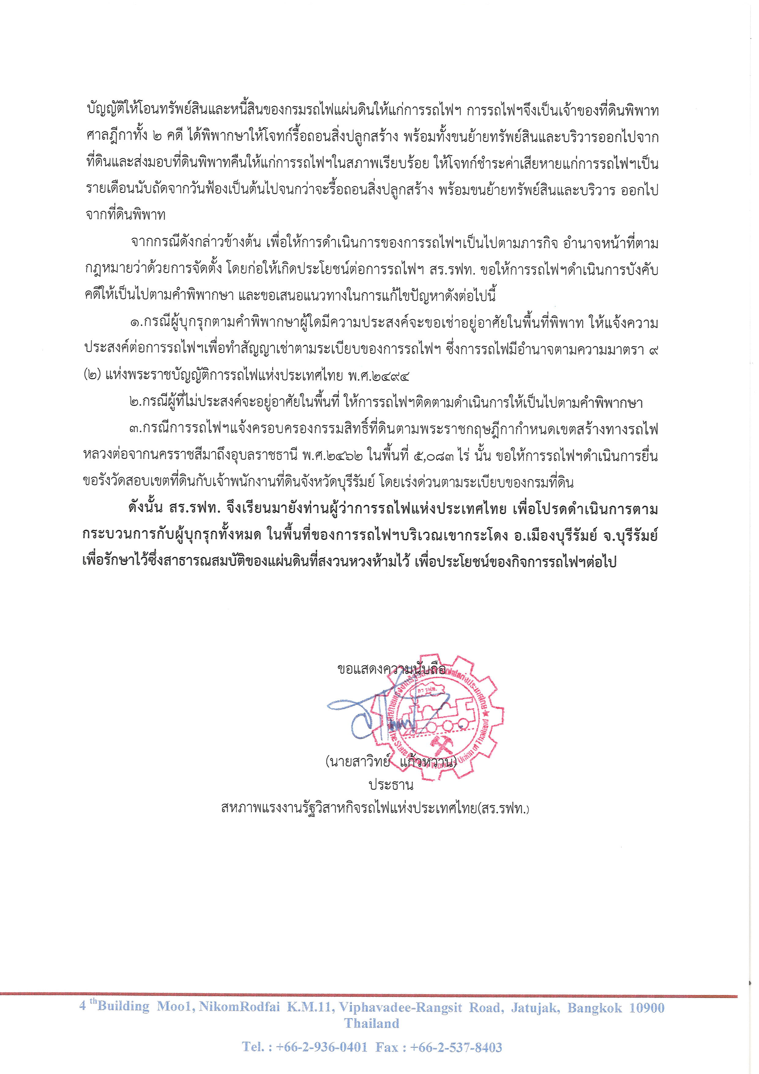 ‘สร.รฟท.’ ยื่นหนังสือถึง ‘ผู้ว่าฯรฟท.’ เรียกร้องให้เร่งบังคับคดีกับผู้บุกรุกที่ดินรถไฟ ‘เขากระโดง’ ตามคำพิพากษาศาล พร้อมเสนอหากผู้บุกรุกรายใดต้องการอาศัยอยู่ต่อไป ให้มาทำสัญญาเช่าที่ดินกับการรถไฟฯ