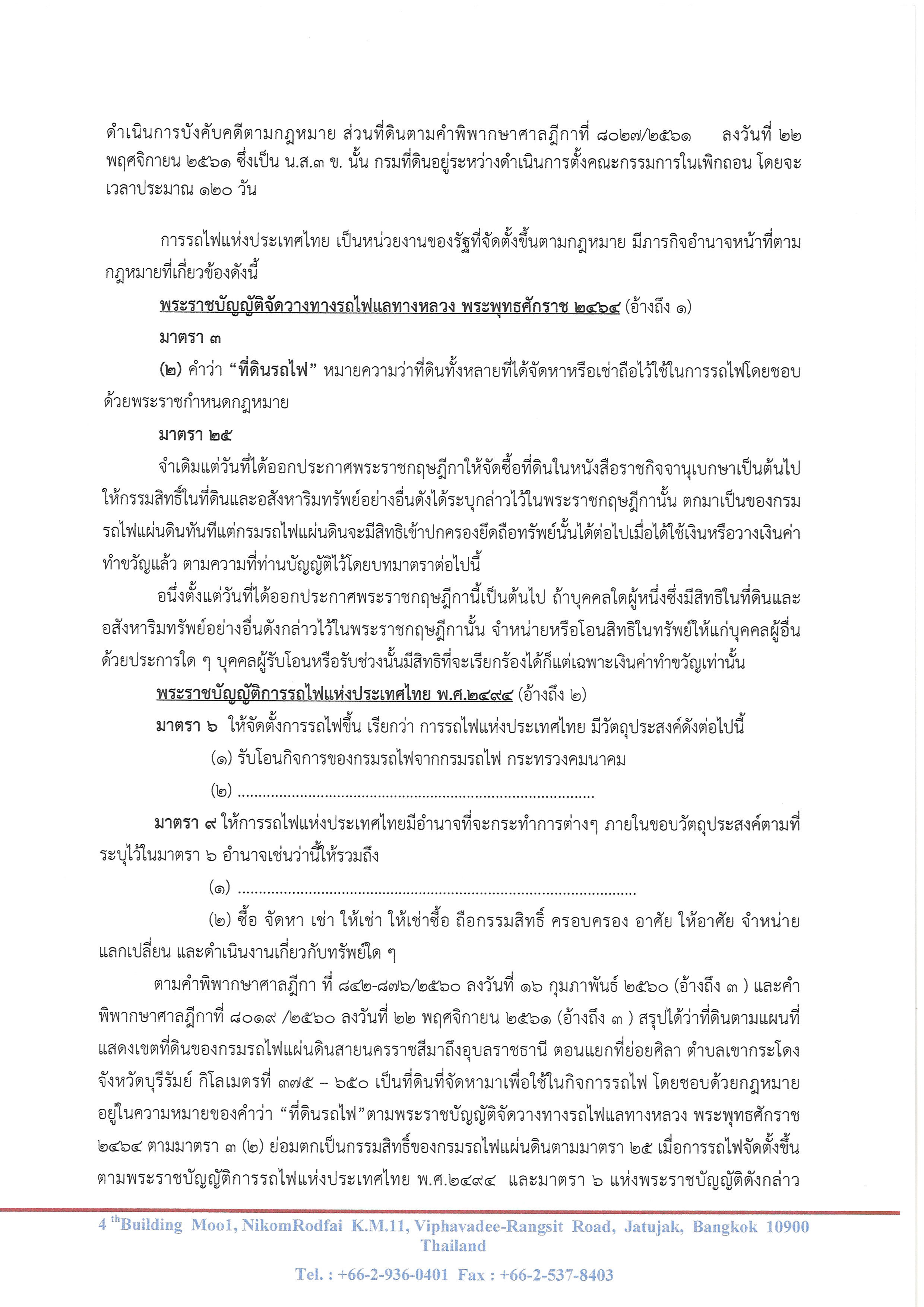 3.ที่ดินตามคำพิพากษาศาลฎีกา ที่ 842-876/2560 ลงวันที่ 16 กุมภาพันธ์ 2560 นั้น เอกสารสิทธิ์ที่เป็น สค.1 กรมที่ดินได้ดำเนินการเพิกถอนเอกสารสิทธิ์ไปเกือบทั้งหมดแล้ว และให้การรถไฟฯดำเนินการบังคับคดีตามกฎหมาย ส่วนที่ดินตามคำพิพากษาศาลฎีกาที่ 8027/2561 ลงวันที่ 22 พฤศจิกายน 2561 ซึ่งเป็น น.ส.3 ข. นั้น กรมที่ดินอยู่ระหว่างดำเนินการตั้งคณะกรรมการในเพิกถอน โดยจะเวลาประมาณ 120 วัน