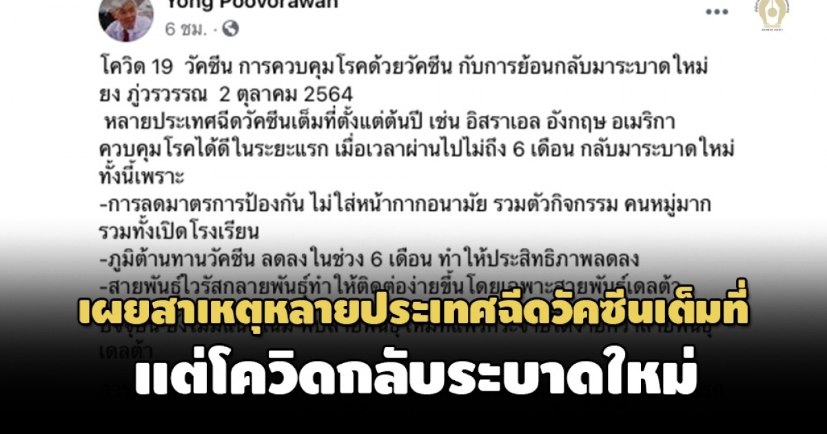 ผู้สื่อข่าวรายงานว่า เมื่อวันที่ 2 ก.ย.2564 ศ.นพ.ยง ภู่วรวรรณ หัวหน้าศูนย์เชี่ยวชาญเฉพาะทางด้านไวรัสวิทยาคลินิก ภาควิชากุมารเวชศาสตร์ คณะแพทยศาสตร์ จุฬาลงกรณ์มหาวิทยาลัย โพสต์ข้อความผ่านเฟซบุ๊ก Yong Poovorawan กล่าวถึงการควบคุมโรคด้วยวัคซีนและการย้อนกลับมาระบาดใหม่ว่า หลายประเทศฉีดวัคซีนเต็มที่ตั้งแต่ต้นปี เช่น อิสราเอล อังกฤษ อเมริกา ควบคุมโรคได้ดีในระยะแรก เมื่อเวลาผ่านไปไม่ถึง 6 เดือน กลับมาระบาดใหม่ ทั้งนี้เพราะสาเหตุดังนี้