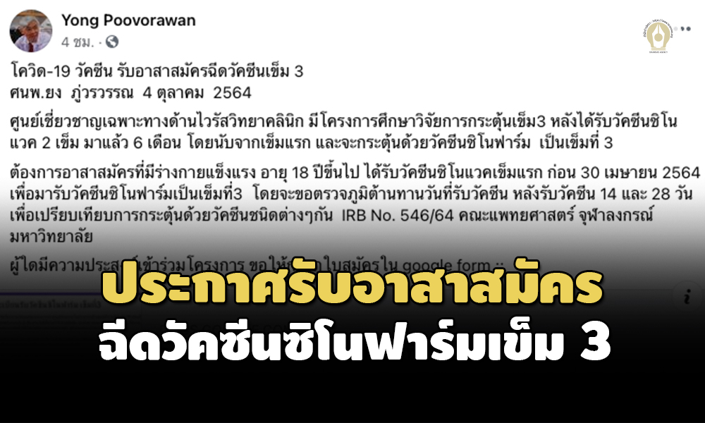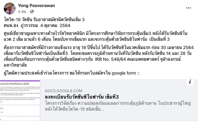 ผู้สื่อข่าวรายงานว่า เมื่อวันที่ 4 ต.ค.2564 ศ.นพ.ยง ภู่วรวรรณ หัวหน้าศูนย์เชี่ยวชาญเฉพาะทางด้านไวรัสวิทยาคลินิก ภาควิชากุมารเวชศาสตร์ คณะแพทยศาสตร์ จุฬาลงกรณ์มหาวิทยาลัย โพสต์ข้อความผ่านเฟซบุ๊ก Yong Poovorawan กล่าวถึงการรับอาสาสมัครฉีดวัคซีนเข็ม 3 ระบุว่า ศูนย์เชี่ยวชาญเฉพาะทางด้านไวรัสวิทยาคลินิก มีโครงการศึกษาวิจัยการกระตุ้นเข็ม 3 หลังได้รับวัคซีนซิโนแวค 2 เข็ม มาแล้ว 6 เดือน โดยนับจากเข็มแรก และจะกระตุ้นด้วยวัคซีนซิโนฟาร์มเป็นเข็มที่ 3