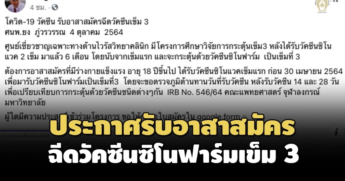 ต้องการอาสาสมัครที่มีร่างกายแข็งแรง อายุ 18 ปีขึ้นไป ได้รับวัคซีนซิโนแวคเข็มแรก ก่อน 30 เม.ย. 2564 เพื่อมารับวัคซีนซิโนฟาร์มเป็นเข็มที่ 3 โดยจะขอตรวจภูมิต้านทานวันที่รับวัคซีน หลังรับวัคซีน 14 และ 28 วัน เพื่อเปรียบเทียบการกระตุ้นด้วยวัคซีนชนิดต่างๆกัน IRB No. 546/64 คณะแพทยศาสตร์ จุฬาลงกรณ์มหาวิทยาลัย