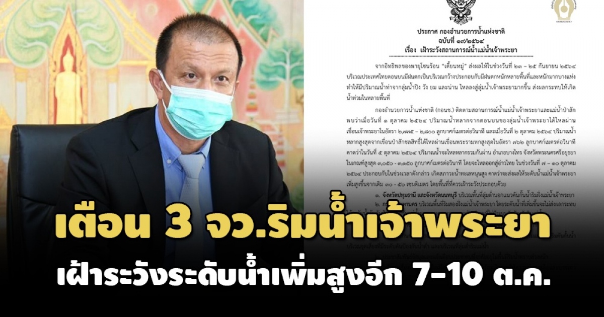 กอนช.ออกประกาศเตือน กทม.-ปทุมธานี-นนทบุรี ริมแม่น้ำเจ้าพระยา เฝ้าระวังระดับน้ำเพิ่มสูงอีก 30-50 ซม. ช่วง 7-10 ต.ค.นี้