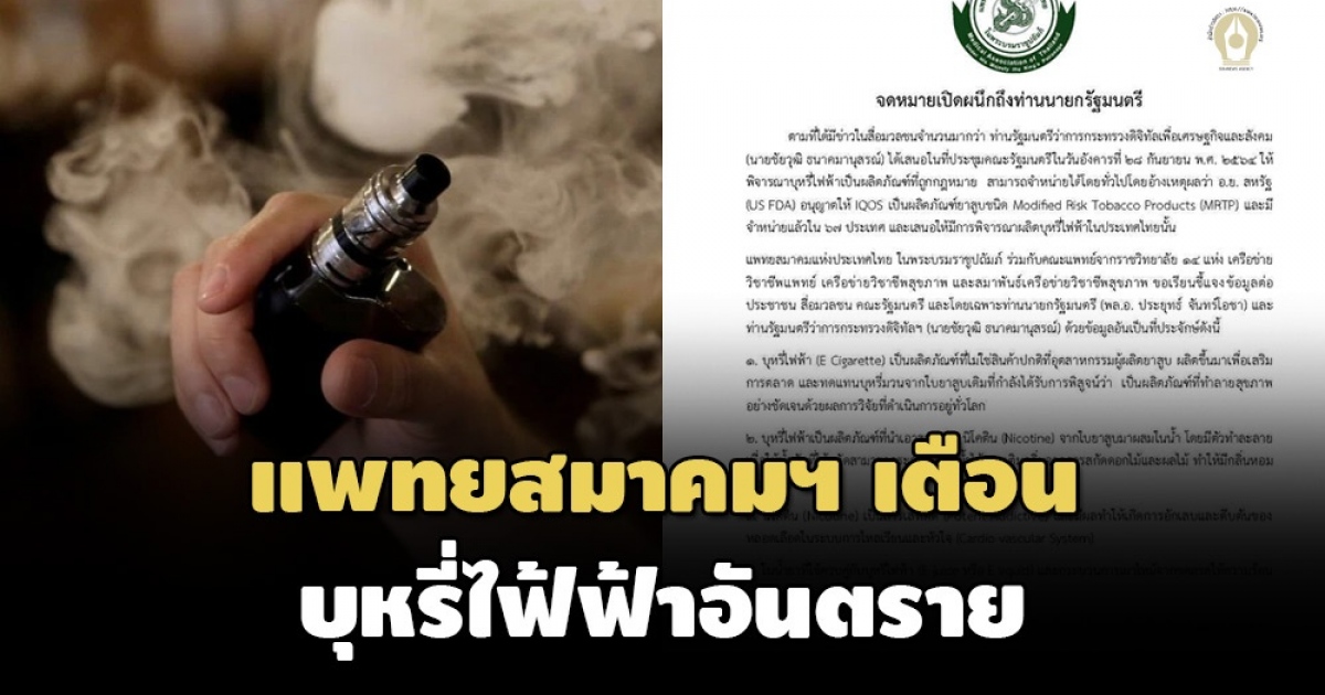 แพทยสมาคมฯ ส่งจดหมายเปิดผนึกถึงนายกฯ ปราม รมว.ดีอีเอสออกหน้าหนุนบุหรี่ไฟฟ้า ชี้ยังอันตรายต่อสุขภาพ สารนิโคตินยากต่อการควบคุม มีสารก่อมะเร็ง ยันหลายประเทศยังแบน ย้ำป้องกัน ดีกว่าแก้