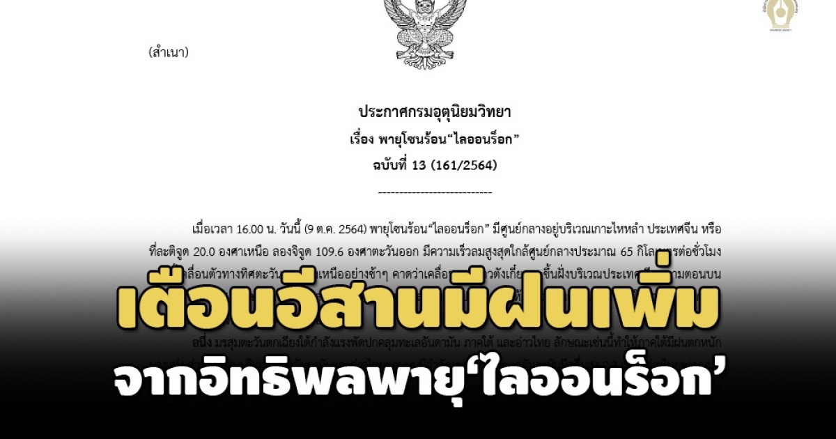 ผู้สื่อข่าวรายงานว่า เมื่อวันที่ 9 ต.ค.2564 กรมอุตุนิยมวิทยาออกประกาศฉบับที่ 13 ผ่านเฟซบุ๊ก กรมอุตินิยมวิทยา ระบุว่า พายุโซนร้อน 'ไลออนร็อก' มีศูนย์กลางอยู่บริเวณเกาะไหหลำ ประเทศจีน หรือที่ละติจูด 20.0 องศาเหนือ ลองจิจูด 109.6 องศาตะวันออก มีความเร็วลมสูงสุดใกล้ศูนย์กลางประมาณ 65 กิโลเมตรต่อชั่วโมง พายุนี้เคลื่อนตัวทางทิศตะวันตกเฉียงเหนืออย่างช้าๆ คาดว่าเคลื่อนลงสู่อ่าวตังเกี๋ยและขึ้นฝั่งบริเวณประเทศเวียดนามตอนบน ในช่วงวันที่ 10-11 ต.ค.2564 และจะอ่อนกำลังลงตามลำดับต่อไป ซึ่งจะทำให้ภาคตะวันออกเฉียงเหนือในช่วงเวลาดังกล่าวจะมีฝนเพิ่มขึ้น ส่วนมากทางตอนบนของภาค