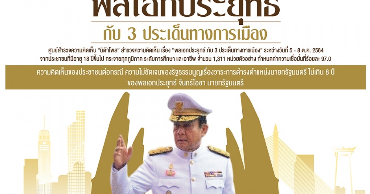 ศูนย์สำรวจความคิดเห็น “นิด้าโพล” สถาบันบัณฑิตพัฒนบริหารศาสตร์ (นิด้า) เปิดเผยผลสำรวจของประชาชน เรื่อง “พลเอกประยุทธ์ กับ 3 ประเด็นทางการเมือง” ทำการสำรวจระหว่างวันที่ 5 – 8 ตุลาคม 2564 จากประชาชนที่มีอายุ 18 ปีขึ้นไป กระจายทุกภูมิภาค ระดับการศึกษา และอาชีพทั่วประเทศ รวมทั้งสิ้น จำนวน 1,311 หน่วยตัวอย่าง เกี่ยวกับพลเอกประยุทธ์ กับ 3 ประเด็นทางการเมือง การสำรวจอาศัยการสุ่มตัวอย่างโดยใช้ความน่าจะเป็นจากบัญชีรายชื่อฐานข้อมูลตัวอย่างหลัก (Master Sample) ของ “นิด้าโพล” สุ่มตัวอย่างด้วยวิธีแบบง่าย (Simple Random Sampling) เก็บข้อมูลด้วยวิธีการสัมภาษณ์ทางโทรศัพท์โดยกำหนดค่าความเชื่อมั่นที่ร้อยละ 97.0