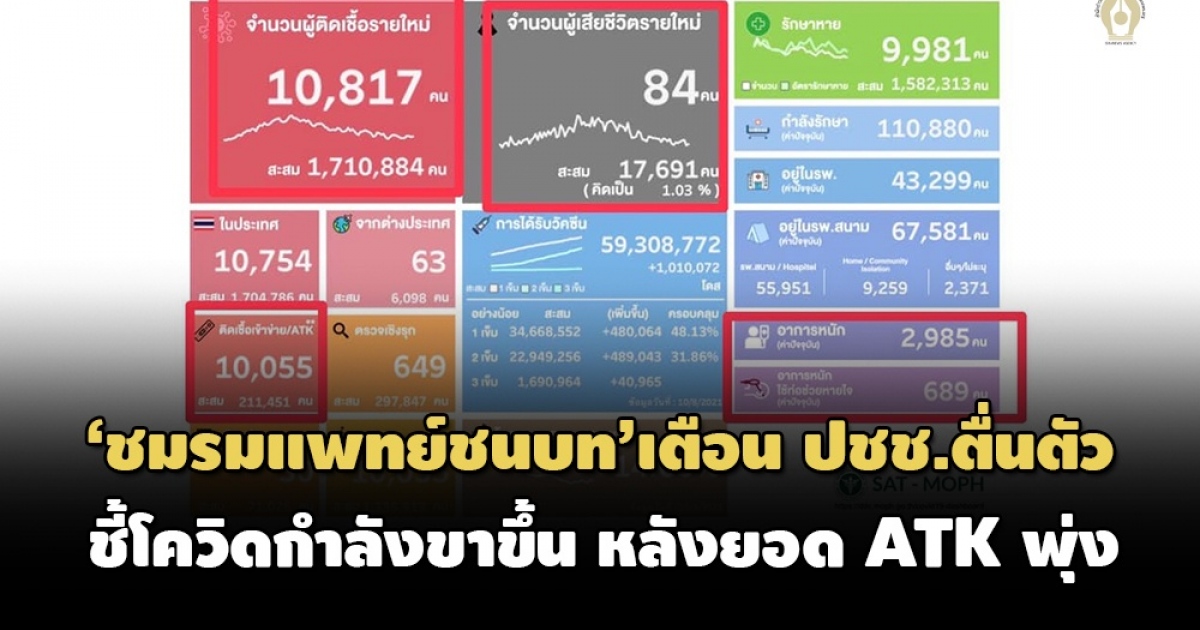 ผู้สื่อข่าวรายงานว่า เมื่อวันที่ 10 ต.ค.2564 ชมรมแพทย์ชนบท โพสต์ข้อความผ่านเฟซบุ๊ก ชมรมแพทย์ชนบท ระบุว่า โปรดให้ความสนใจ และตื่นตัว ระมัดระวัง วันนี้บวกเพิ่ม 10,817 ราย แต่ดูให้ดีๆ การตรวจหาเชื้อมี 2 วิธี วิธีมาตรฐาน RT-PCR พบผู้ติดเชื้อ 10,817 ราย แต่ข้างล่างยังตัวเลขการตรวจด้วย ATK พบเชื้ออีก 10,055 ราย รวมแล้วเป็นกว่า 2 หมื่นราย ในจำนวน ATK บวก ไม่ได้ตรวจยืนยันด้วย RT-PCR ทุกราย จำนวนผู้ติดเชื้อกำลังขาขึ้นอีกครั้งอย่างชัดเจนแล้ว