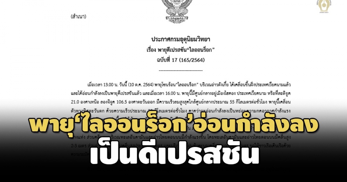 ผู้สื่อข่าวรายงานว่า เมื่อวันที่ 9 ต.ค.2564 กรมอุตุนิยมวิทยาออกประกาศฉบับที่ 17 ผ่านเฟซบุ๊ก กรมอุตินิยมวิทยา ระบุว่า พายุโซนร้อน 'ไลออนร็อก' บริเวณอ่าวตังเกี๋ย ได้เคลื่อนขึ้นฝั่งประเทศเวียดนามแล้ว และได้อ่อนกำลังลงเป็นพายุดีเปรสชัน