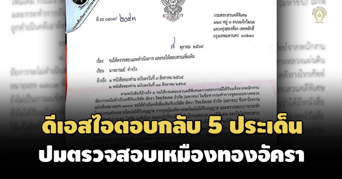 ตามที่มีหนังสือขอให้ดีเอสไอตรวจสอบกรณีได้รับแจ้งจากพนักงานอัยการจะไม่ดำดเนินคดีกับบริษัท อัครา รีซอร์สเซส จำกัด (มหาชน) ในข้อหากระทำการขุดถนนทางหลวงแผ่นดินหมายเลข 1301