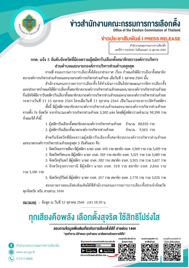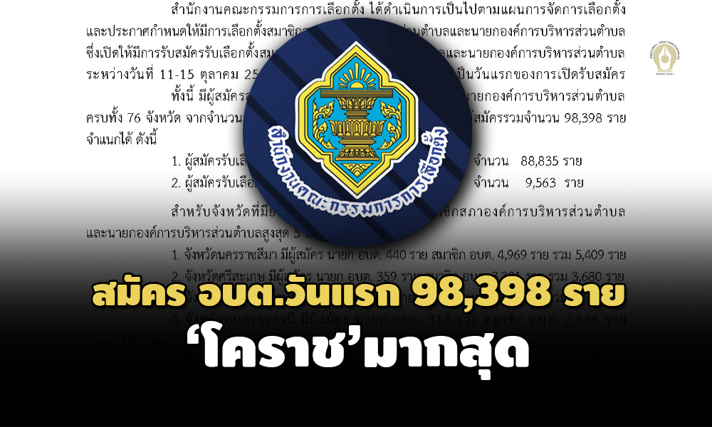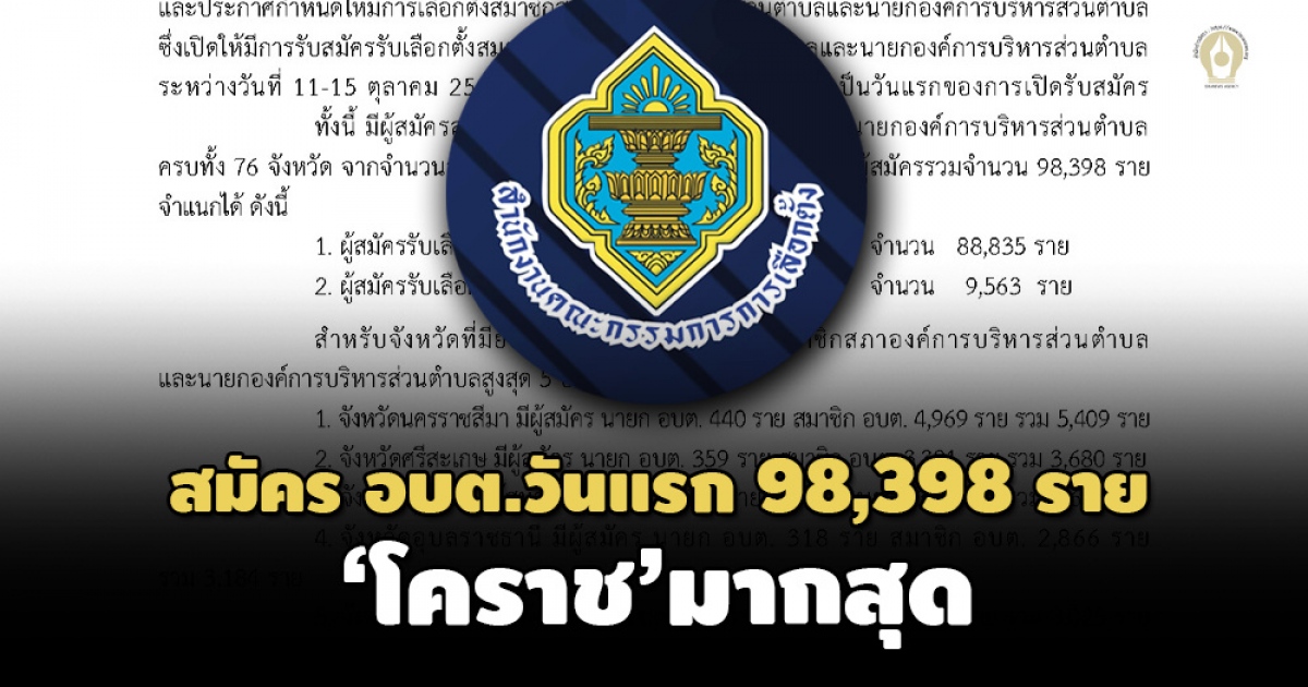 กกต.เผยยอดผู้สมัคร อบต.วันแรก ครบ 76 จังหวัด รวม 98,398 ราย แบ่งเป็นสมาชิกสภา อบต. 88,835 ราย - นายก อบต. 9,563 ราย โดยมีผู้สมัครที่ จ.นครราชสีมามากที่สุด