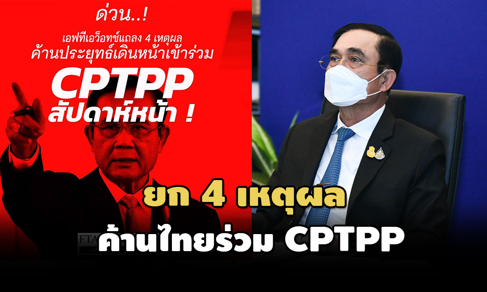 เมื่อวันที่ 13 ต.ค.ที่ผ่านมา กลุ่มศึกษาข้อตกลงเขตการค้าเสรีภาคประชาชน (FTA Watch) ออกแถลงการณ์คัดค้านกรณี พล.อ.ประยุทธ์ จันทร์โอชา นายกรัฐมนตรี และรมว.กลาโหม สั่งการในที่ประชุมคณะรัฐมนตรี (ครม.) ให้ประเทศไทยเดินหน้าเข้าร่วมความตกลงหุ้นส่วนเศรษฐกิจภาคพื้นแปซิฟิก (CPTPP) พร้อมทั้งยก 4 เหตุผลที่ประเทศไทยไม่ควรเข้าร่วมข้อตกลง CPTPP