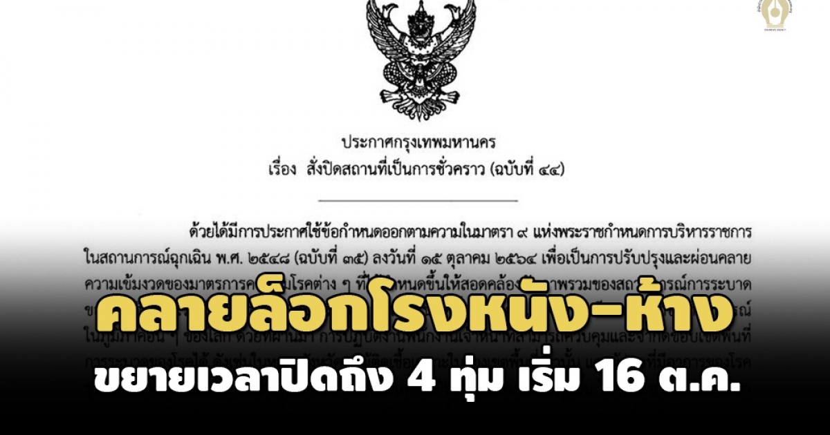 กทม.ออกประกาศฉบับที่ 44 คลายล็อกโรงหนัง-ห้างสรรพสินค้า ขยายเวลาปิดกิจการถึง 4 ทุ่ม จำกัดกิจกรรมที่มีการรวมกลุ่มมากกว่า 50 คน ส่วนผับ บาร์ คาราโอเกะยังคงปิด มีผล 16 ต.ค.นี้
