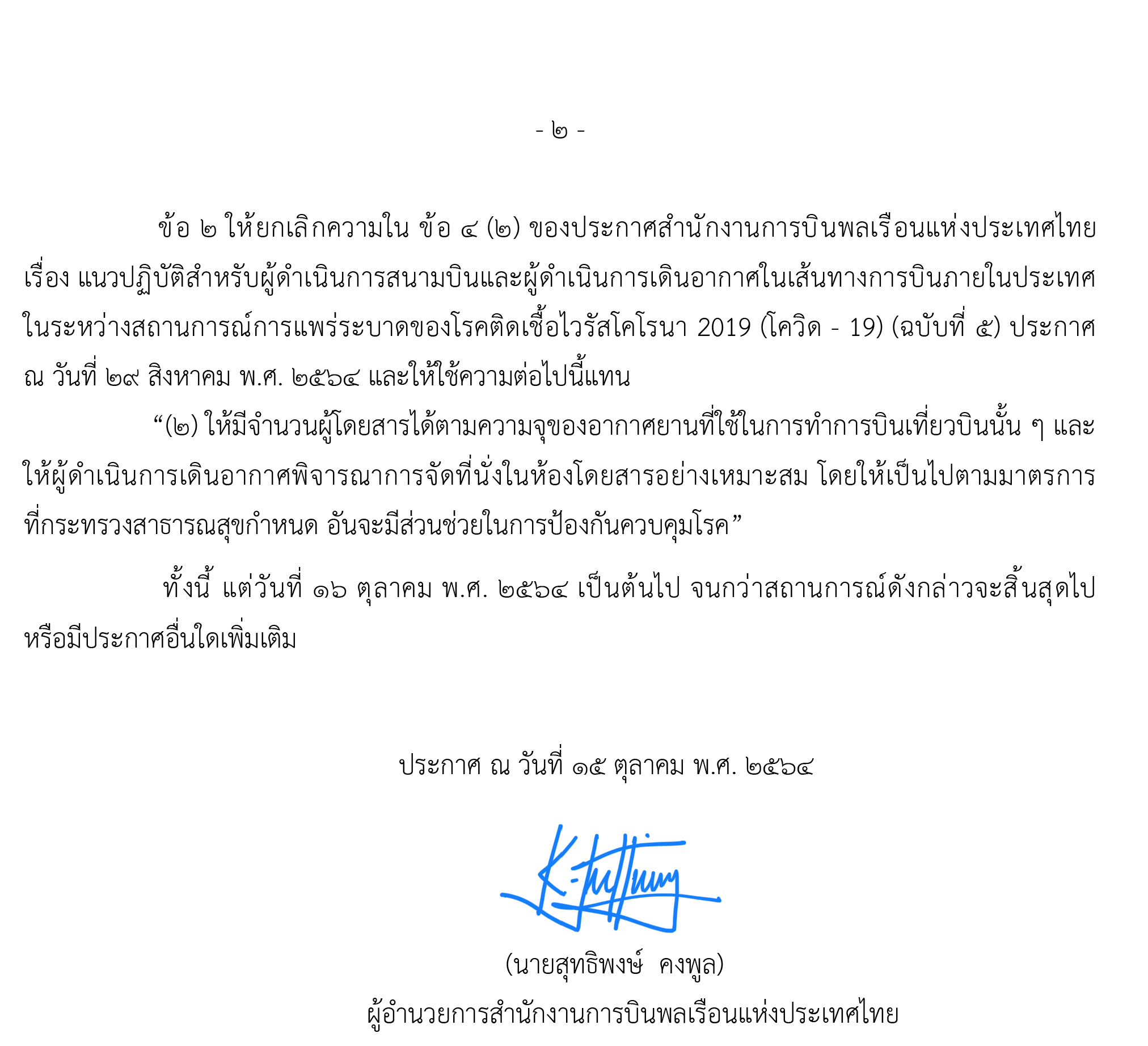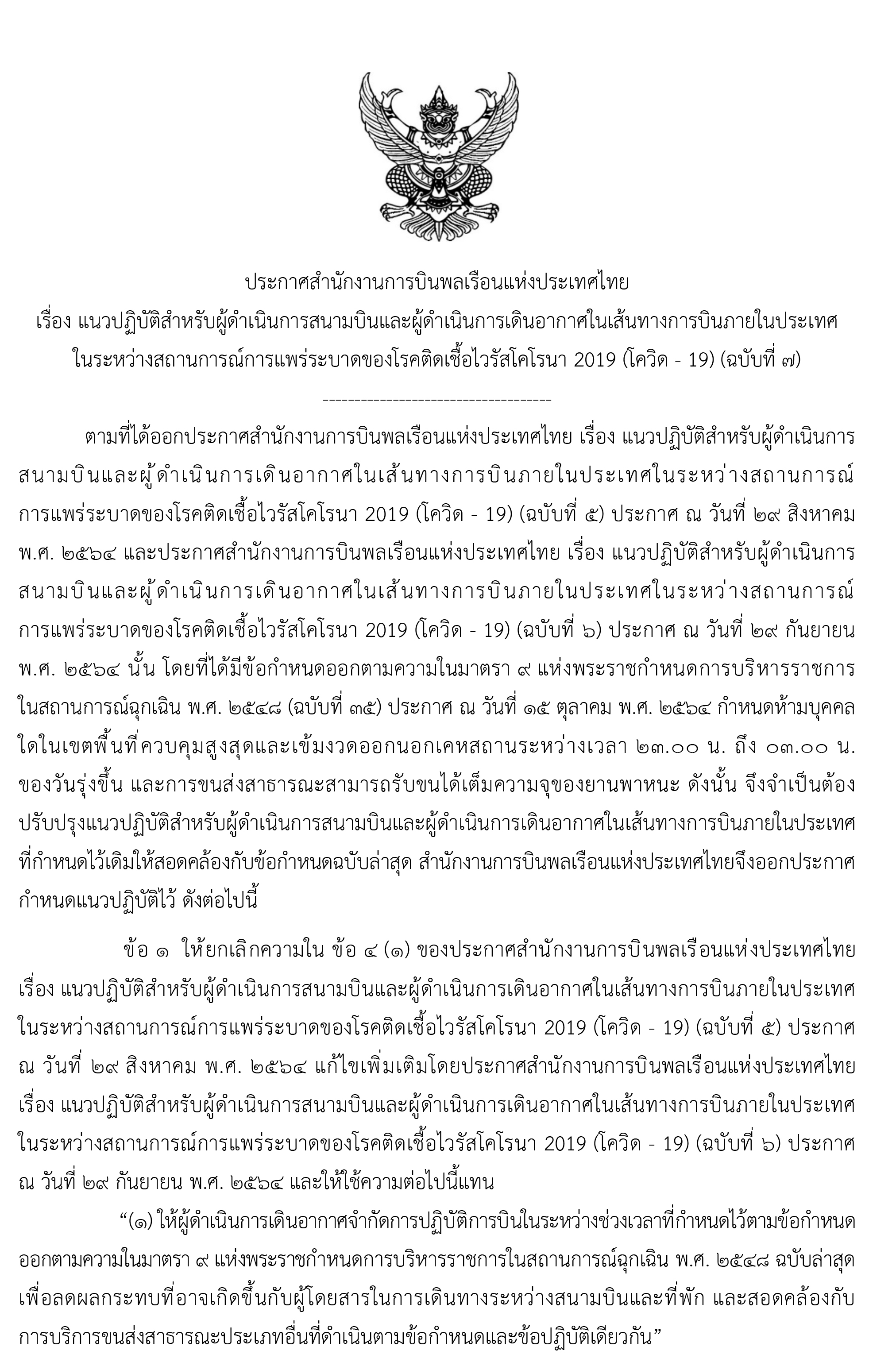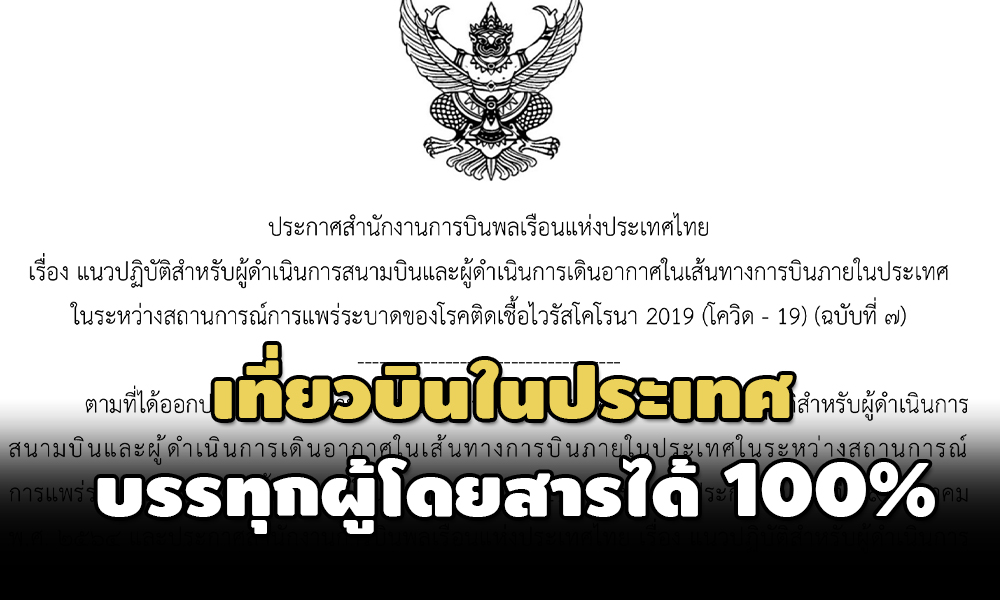 เมื่อวันที่ 15 ต.ค.ที่ผ่านมา นายสุทธิพงษ์ คงพูล ผู้อำนวยการสำนักงานการบินพลเรือนแหงประเทศไทย (กพท.) ลงนามประกาศสำนักงานการบินพลเรือนแหงประเทศไทย เรื่อง แนวปฏิบัติสำหรับผู้ดำเนินการสนามบินและผู้ดำเนินการเดินอากาศในเส้นทางการบินภายในประเทศ ในระหว่างสถานการณ์การแพรระบาดของโรคติดเชื้อไวรัสโคโรนา 2019 (โควิด-19) ฉบับที่ 7 โดยให้มีผลบังคับใช้ตั้งแต่วันที่ 16 ต.ค.2564 ซึ่มีสาระสำคัญ ได้แก่