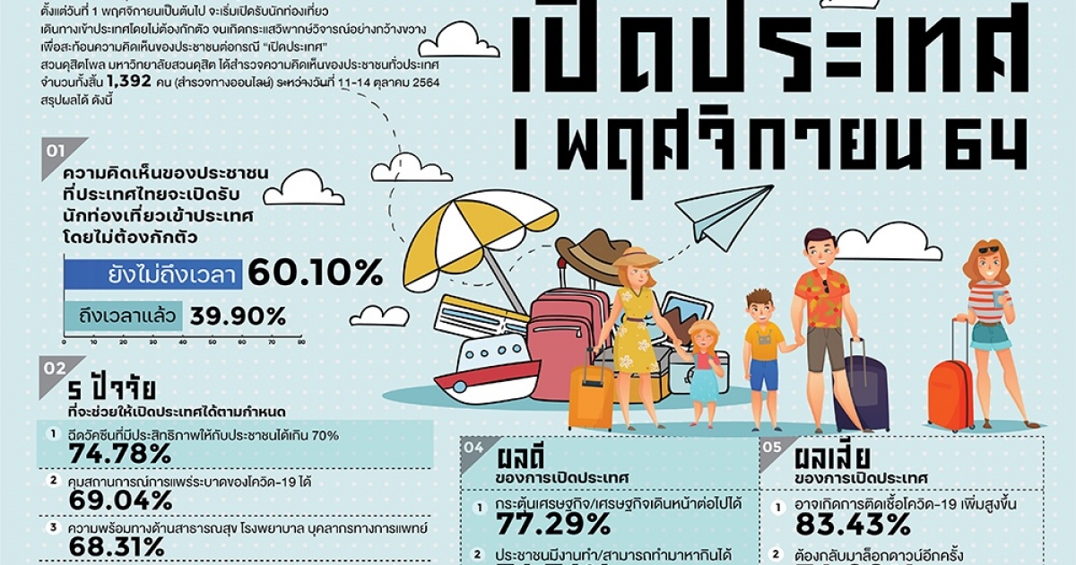 "...สวนดุสิตโพล มหาวิทยาลัยสวนดุสิต สำรวจความคิดเห็นของประชาชนต่อกรณี “เปิดประเทศ 1 พ.ย.64” พบว่า ประชาชนมองว่ายังไม่ถึงเวลาที่จะเปิดประเทศ รับนักท่องเที่ยวโดยไม่ต้องกักตัว ร้อยละ 60.10 ปัจจัยที่จะทำให้เปิดประเทศได้ คือ ต้องฉีดวัคซีนที่มีประสิทธิภาพให้กับประชาชนได้เกิน 70% ร้อยละ 74.78 และมองว่าข้อจำกัดคือ ประชาชนยังไม่ได้รับวัคซีนครบถ้วน ร้อยละ 71.60..."
