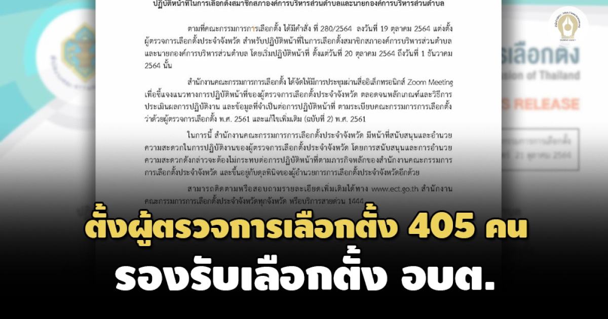 แต่งตั้ง 'ผู้ตรวจการเลือกตั้ง' 405 คน รองรับเลือกตั้ง อบต. เริ่มปฏิบัติหน้าที่ 20 ต.ค.-1 ธ.ค.64