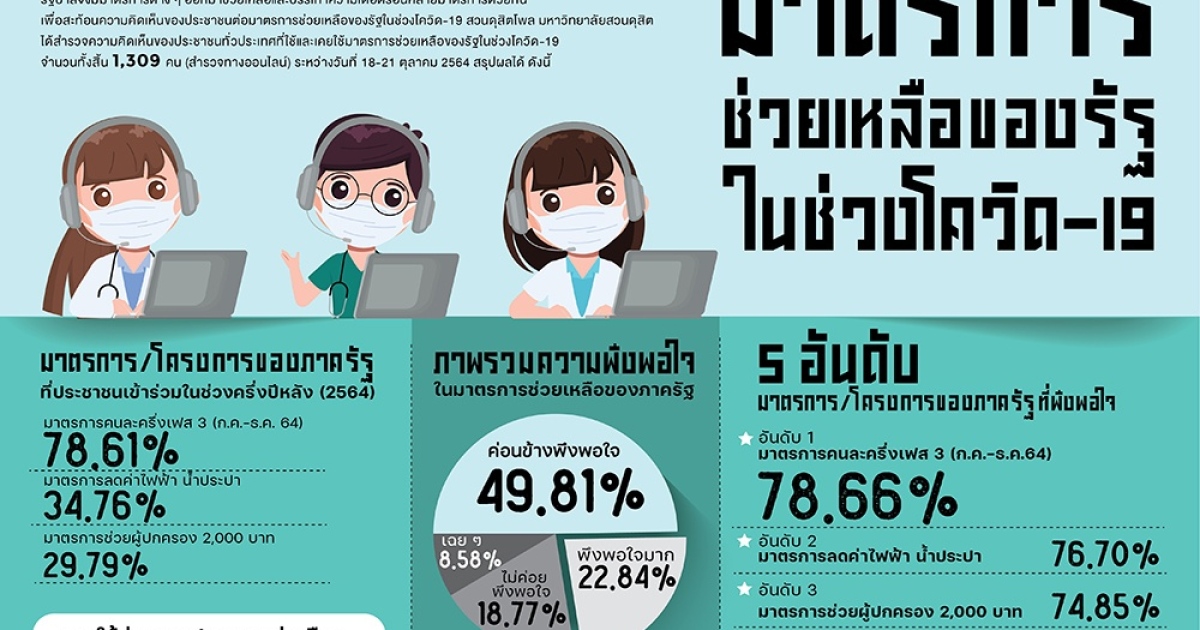 "...สวนดุสิตโพล มหาวิทยาลัยสวนดุสิต สำรวจความคิดเห็นของประชาชนต่อกรณี มาตรการช่วยเหลือของรัฐในช่วงโควิด-19 พบว่า ภาพรวมประชาชนค่อนข้างพึงพอใจมาตรการช่วยเหลือของภาครัฐ ร้อยละ 49.81 โดยพึงพอใจมาตรการคนละครึ่งเฟส 3 มากที่สุด ร้อยละ 78.66..."