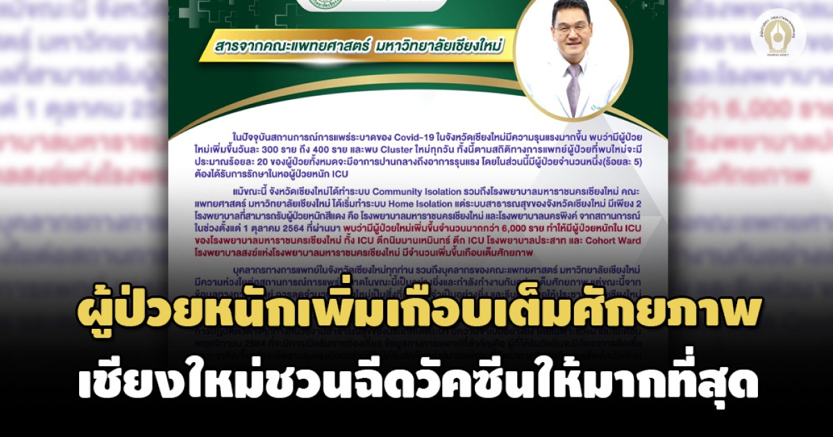 คณะแพทยศาสตร์ ม.เชียงใหม่ เตือนสถานการณ์โควิดในจังหวัด พบผู้ป่วยหนักเพิ่มขึ้นเกือบเต็มศักยภาพ เชิญชวนประชาชนเร่งฉีดวัคซีนให้มากที่สุด