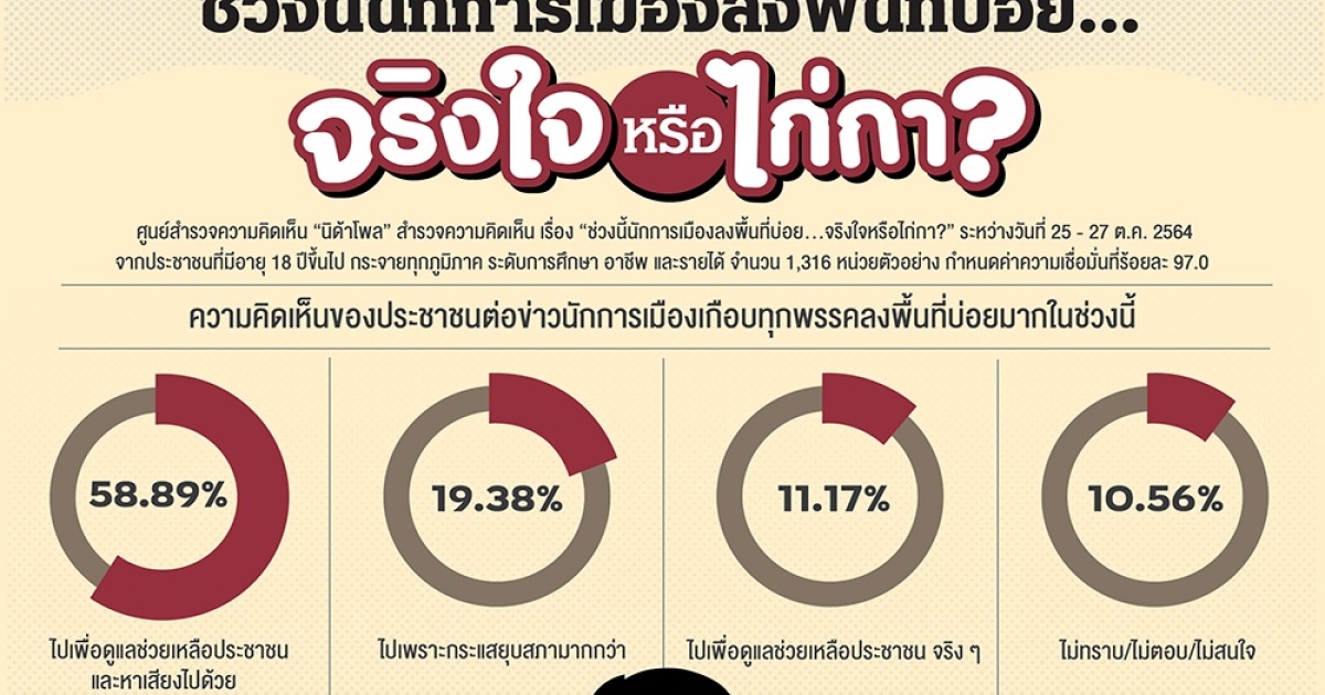 ศูนย์สำรวจความคิดเห็น “นิด้าโพล” สถาบันบัณฑิตพัฒนบริหารศาสตร์ (นิด้า) เปิดเผยผลสำรวจของประชาชน เรื่อง “ช่วงนี้นักการเมืองลงพื้นที่บ่อย…จริงใจหรือไก่กา?” ทำการสำรวจระหว่างวันที่ 25-27 ตุลาคม 2564 จากประชาชนที่มีอายุ 18 ปีขึ้นไป กระจายทุกภูมิภาค ระดับการศึกษา และอาชีพทั่วประเทศ รวมทั้งสิ้น จำนวน 1,316 หน่วยตัวอย่าง เกี่ยวกับการที่มีข่าวนักการเมืองเกือบทุกพรรคลงพื้นที่บ่อยมากในช่วงนี้ เป็นความจริงใจเพื่อดูแลช่วยเหลือประชาชน หรือเป็นเพราะกระแสการยุบสภากันแน่ การสำรวจอาศัยการสุ่มตัวอย่างโดยใช้ความน่าจะเป็นจากบัญชีรายชื่อฐานข้อมูลตัวอย่างหลัก (Master Sample) ของ “นิด้าโพล” สุ่มตัวอย่างด้วยวิธีแบบง่าย (Simple Random Sampling) เก็บข้อมูลด้วยวิธีการสัมภาษณ์ทางโทรศัพท์โดยกำหนดค่าความเชื่อมั่นที่ร้อยละ 97.0