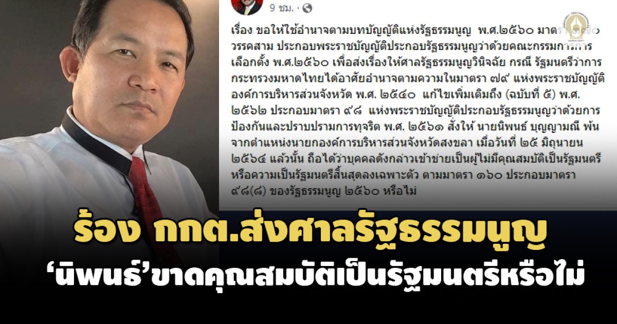 ผู้สื่อข่าวรายงานว่า เมื่อวันที่ 31 ตุลาคม 2564 นายศรีสุวรรณ จรรยา เลขาธิการสมาคมองค์การพิทักษ์รัฐธรรมนูญไทย โพสต์ข้อความผ่านเฟซบุ๊กว่า ในวันที่ 1 พฤศจิกายน 2564 จะเดินทางไปยื่นคำร้องต่อคณะกรรมการการเลือกตั้ง (กกต.) เพื่อขอให้ยื่นศาลรัฐธรรมนูญวินิจฉัย กรณีนายนิพนธ์ บุญญามณี รมช.มหาดไทย ขาดจากความเป็นรัฐมนตรี ตามรัฐธรรมนูญมาตรา 170 (4) ความเป็นรัฐมนตรีสิ้นสุดลงเฉพาะตัว เมื่อขาดคุณสมบัติหรือมีลักษณะต้องห้ามตามมาตรา 160 ซึ่งว่าด้วยเรื่อง รัฐมนตรีต้องไม่มีลักษณะต้องห้ามตามมาตรา 98 (8)