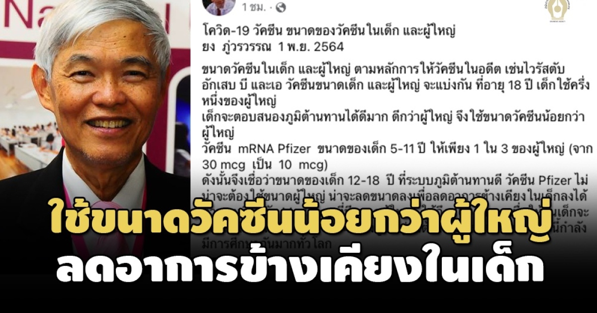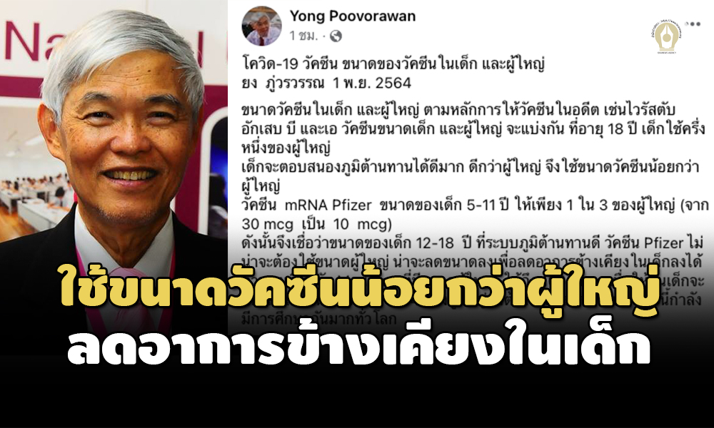 ผู้สื่อข่าวรายงานว่า เมื่อวันที่ 1 พ.ย.2564 ศ.นพ.ยง ภู่วรวรรณ หัวหน้าศูนย์เชี่ยวชาญเฉพาะทางด้านไวรัสวิทยาคลินิก คณะแพทยศาสตร์ จุฬาลงกรณ์มหาวิทยาลัย โพสต์เฟซบุ๊ก Yong Poovorawan เรื่องขนาดการฉีดวัคซีนในเด็กและผู้ใหญ่ ระบุว่า ขนาดวัคซีนในเด็ก และผู้ใหญ่ ตามหลักการให้วัคซีนในอดีต เช่นไวรัสตับอักเสบ บี และเอ วัคซีนขนาดเด็ก และผู้ใหญ่ จะแบ่งกัน ที่อายุ 18 ปี เด็กใช้ครึ่งหนึ่งของผู้ใหญ่ แต่เด็กจะตอบสนองภูมิต้านทานได้ดีมาก ดีกว่าผู้ใหญ่ จึงใช้ขนาดวัคซีนน้อยกว่าผู้ใหญ่ วัคซีนชนิด mRNA ของ Pfizer ขนาดวัคซีนสำหรับเด็ก 5-11 ปี ให้เพียง 1 ใน 3 ของผู้ใหญ่ คือ จาก 30 ไมโครกรัม เป็น 10 ไมโครกรัม