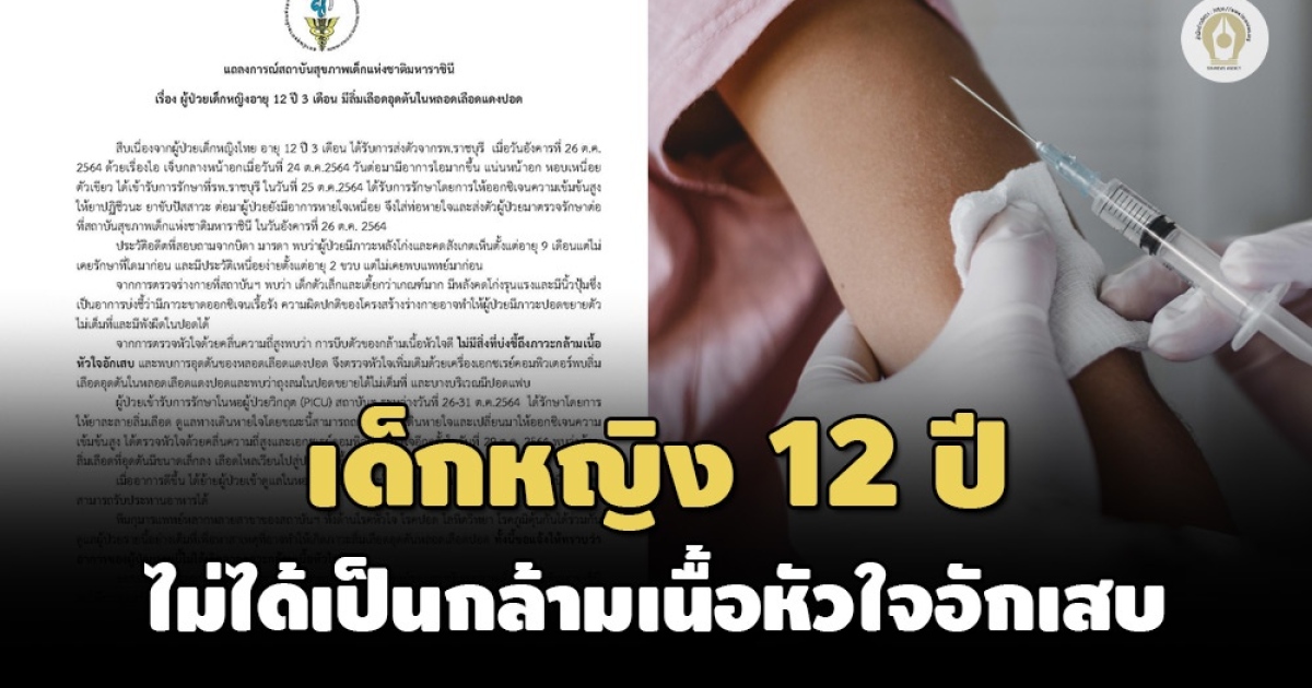 สถาบันสุขภาพเด็กแห่งชาติมหาราชินี กรมการแพทย์ ได้ออก แถลงการณ์ เรื่อง ผู้ป่วยเด็กหญิงอายุ 12 ปี 3 เดือน มีลิ่มเลือดอุดตันในหลอดเลือดแดงปอด ระบุว่า