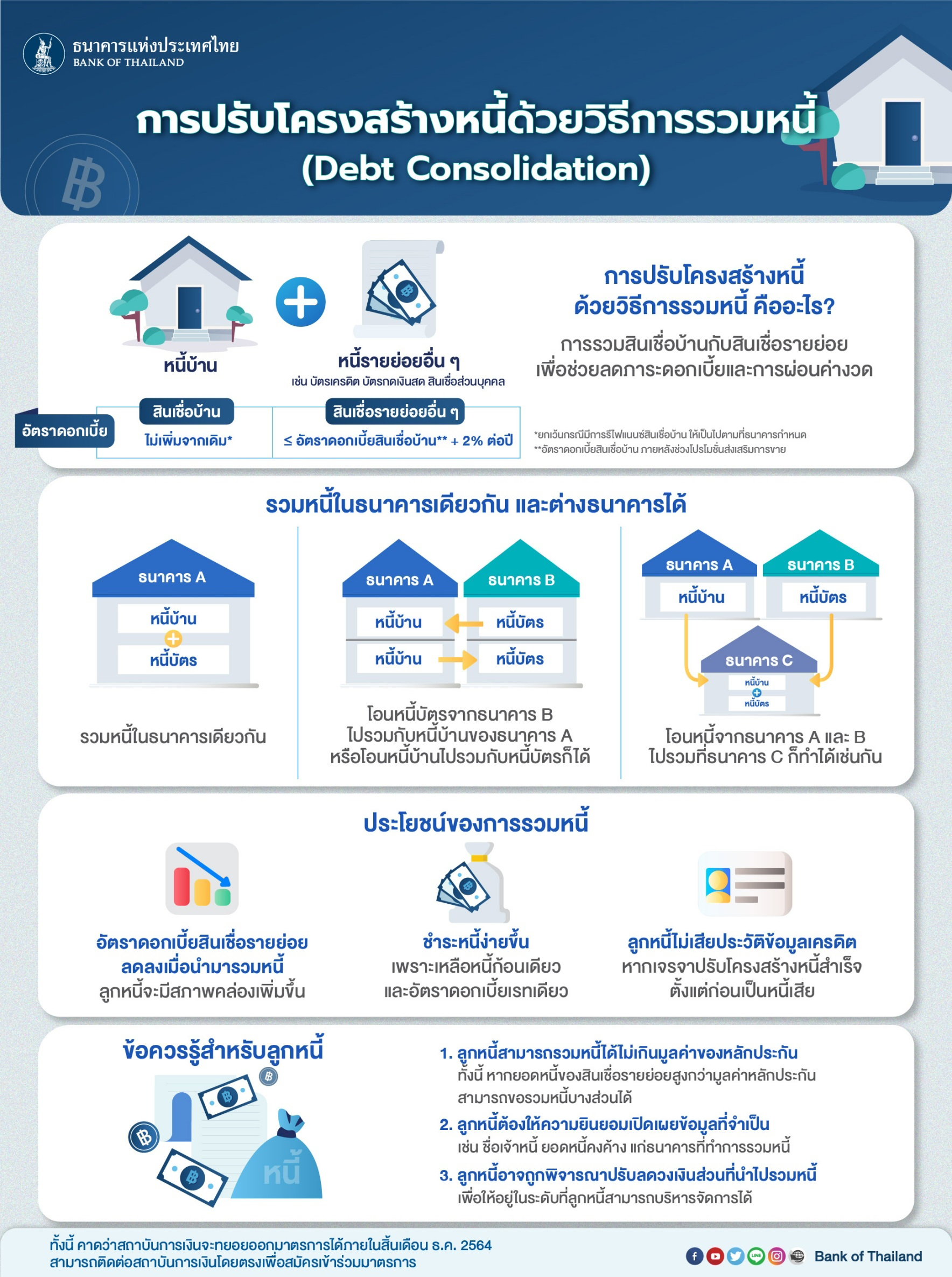เพื่อให้การช่วยเหลือขยายออกไปครอบคลุมกลุ่มลูกหนี้ที่มีหลักประกันประเภทสินเชื่อเพื่อที่อยู่อาศัยในวงที่กว้างขึ้น ธปท. จึงกำหนดให้มีแรงจูงใจในการสนับสนุนให้สถาบันการเงินทำการรวมหนี้สินเชื่อเพื่อที่อยู่อาศัยและสินเชื่อรายย่อยประเภทอื่น (debt consolidation) เข้าด้วยกัน เพื่อช่วยเหลือลูกหนี้ที่มีประวัติการชำระหนี้ดี หรือลูกหนี้ที่ได้รับผลกระทบจากสถานการณ์โควิด 19 ด้วยการนำหลักประกันของสินเชื่อเพื่อที่อยู่อาศัยที่มีอยู่มาใช้ประโยชน์ในการช่วยลดภาระดอกเบี้ยและค่างวดในระยะยาว