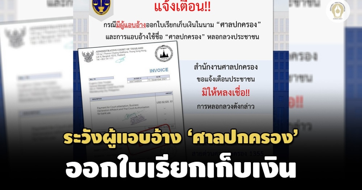 แจ้งเตือนประชาชน หลังมีผู้แอบอ้างใช้ชื่อ 'ศาลปกครอง' หลอกลวงออกใบเรียกเก็บเงินเป็นภาษาอังกฤษ ยันไม่มีวิธีเกออกเอกสารเป็นภาษาไทย-ใช้สกุลเงินบาทเท่านั้น