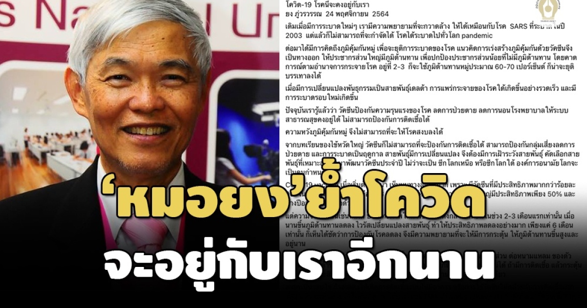 ‘หมอยง’ ย้ำโควิดจะอยู่กับเราอีกนาน เหตุไวรัสเปลี่ยนแปลงพันธุกรรมเป็นสายพันธุ์เดลต้า ทำให้วัคซีนประสิทธิภาพวัคซีนลดลง-ภูมิต้านทานลดลงใน 6 เดือน ชี้ต้องฉีดกระตุ้น กลุ่มเสี่ยงต้องได้รับวัคซีนทั้งหมด พร้อมเร่งรัดให้ไทยฉีดให้ครบ 100 ล้านโดส 5 ธ.ค.นี้