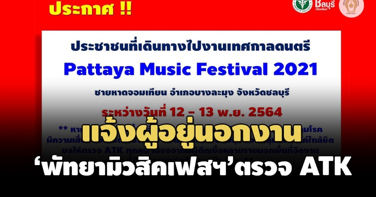 สสจ.ชลบุรี ประกาศให้ผู้อยู่นอกงาน 'Pattaya Music Festival 2021' 12-13 พ.ย.64 แล้วไม่ป้องกันโควิดเข้ม ขอให้ตรวจ ATK ทุกคน เหตุพบผู้ติดเชื้อหลายรายนอกพื้นที่จัดงานรวมกลุ่มสังสรรค์