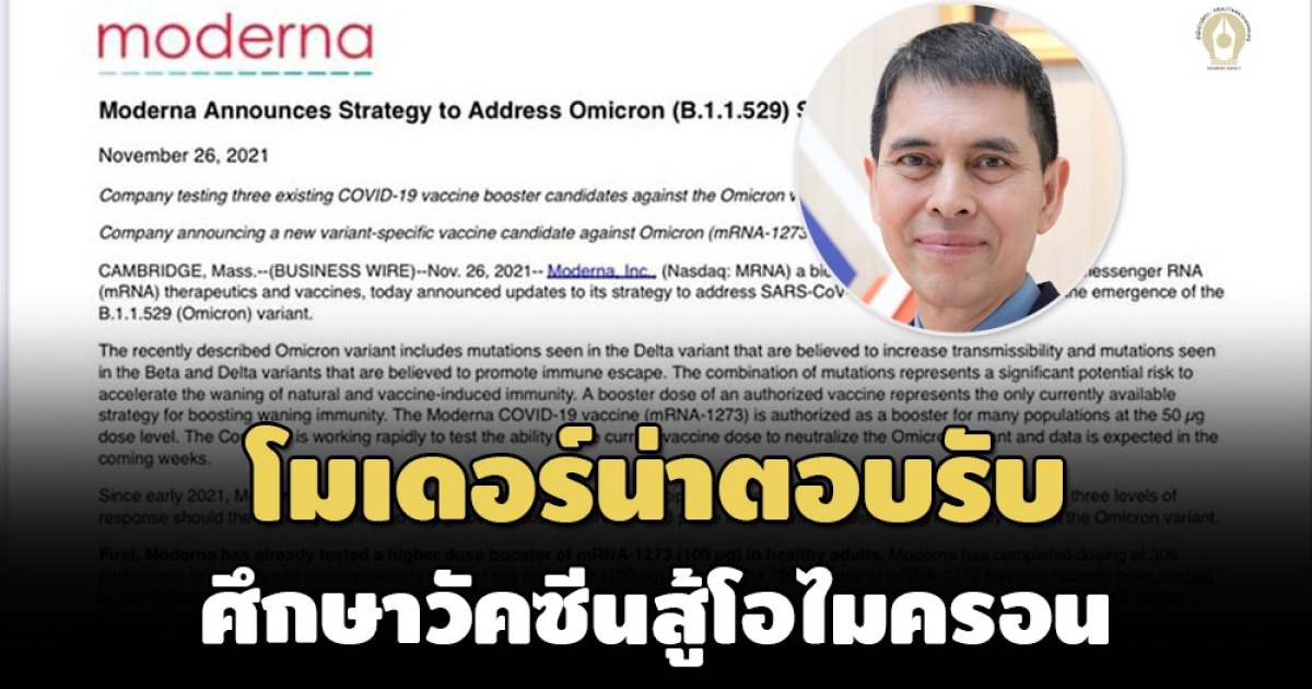 ผู้สื่อข่าวรายงานว่า เมื่อวันที่ 27 พ.ย. 2564 ศ.นพ.นิธิ มหานนท์ เลขาธิการราชวิทยาลัยจุฬาภรณ์ โพสต์ข้อความผ่านเฟซบุ๊ก Nithi Mahanonda ระบุว่า โมเดอร์น่า มีการตอบรับศึกษาเรื่อง สายพันธุ์โอไมครอนอย่างได้เร็วมาก แต่คงต้องรอผลนิดหนึ่งสักประมาณอาทิตย์ ว่าจะใช้ขนาดเท่าไหร่ และต้องเป็น multivalent ใดที่ต้องใช้เป็นการเฉพาะสำหรับกระตุ้นภูมิ