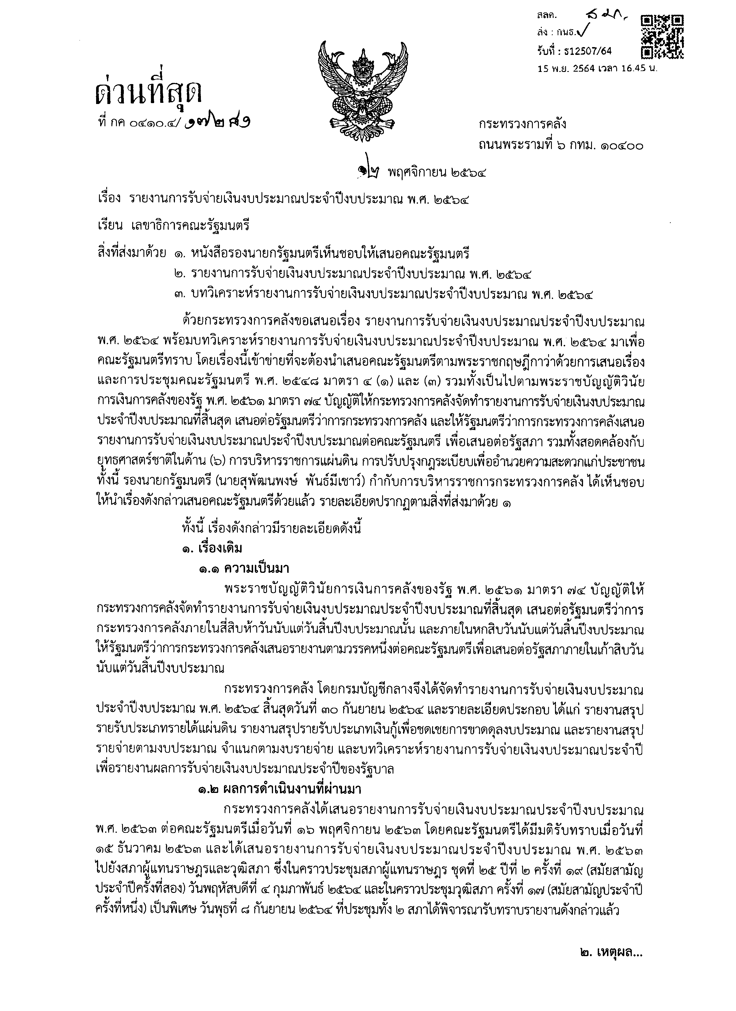 สำนักข่าวอิศรา (www.isranews.org) รายงานเพิ่มเติมว่า ในการประชุมคณะรัฐมนตรี (ครม.) เมื่อวันที่ 23 พ.ย.ที่ผ่านมา ที่ประชุม ครม. รับทราบรายงานการรับจ่ายเงินงบประมาณรายจ่ายประจำปีประมาณ พ.ศ.2564 ผลปรากฏว่า ในปีงบประมาณ 2564 รัฐบาลมีการรับรายได้แผ่นดินทั้งสิ้น 2.43 ล้านล้านบาท เทียบกับประมาณการรายได้แผ่นดินที่ตั้งไว้ 2.67 ล้านล้านบาท หรือต่ำกว่าประมาณการ 2.39 แสนล้านบาท