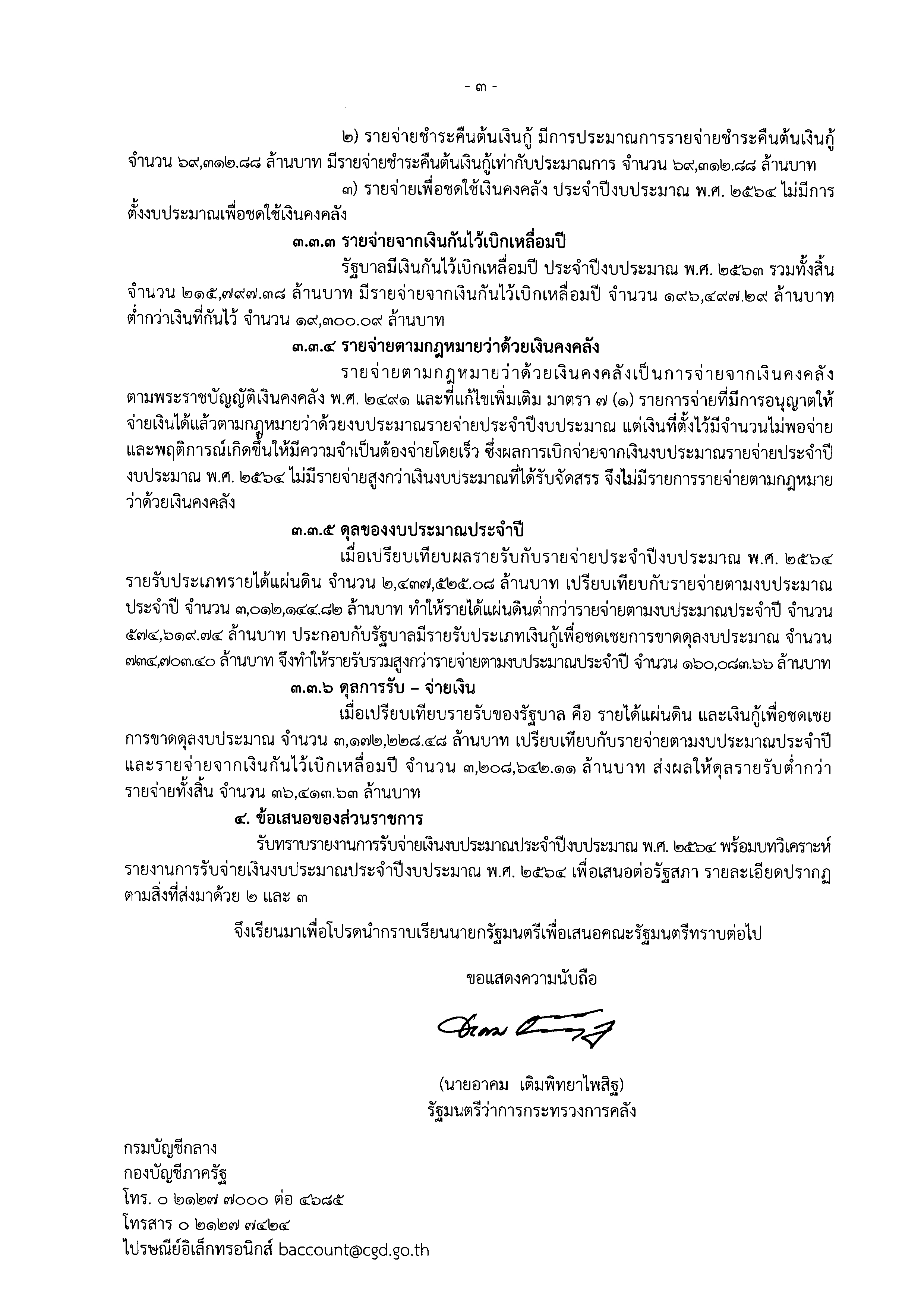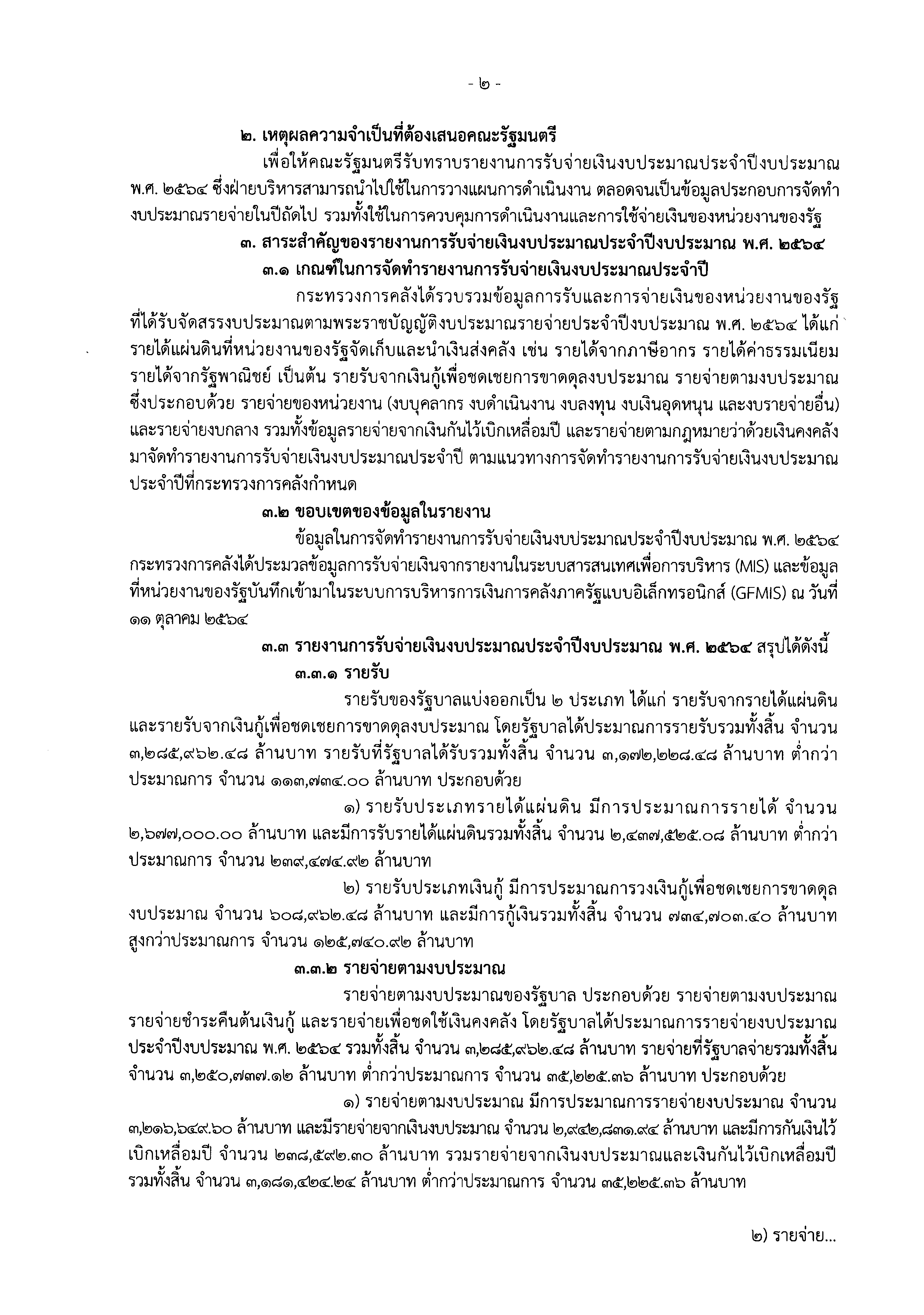 “เมื่อเปรียบเทียบผลรายรับกับรายจ่ายประจำปีงบประมาณ พ.ศ.2564 รายรับประเภทรายได้แผ่นดิน จำนวน 2,437,525.08 ล้านบาท เปรียบเทียบกับรายจ่ายตามงบประมาณประจำปี จำนวน 3,012,144.82 ล้านบาท ทำให้รายได้แผ่นดินต่ำกว่ารายจ่ายตามงบประมาณประจำปี จำนวน 574,619.74 ล้านบาท ประกอบกับรัฐบาลมีรายรับประเภทเงินกู้เพื่อชดเชยการขาดดุลงบประมาณ จำนวน 734,703.40 ล้านบาท จึงทำให้รายรับรวมสูงกว่ารายจ่ายตามงบประมาณประจำปี จำนวน 160,083.66 ล้านบาท” กระทรวงการคลังรายงาน ครม.