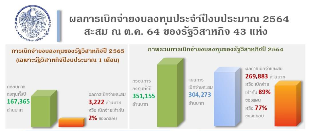 สำหรับผลการเบิกจ่ายงบลงทุนรัฐวิสาหกิจในปี 2564 ณ สิ้นเดือน ต.ค.2564 มีผลการเบิกจ่ายงบลงทุนสะสม จำนวน 269,883 ล้านบาท หรือคิดเป็น 89% ของแผนการเบิกจ่ายสะสม ส่วนรัฐวิสาหกิจ ซึ่งเบิกจ่ายงบตามปีงบประมาณ ซึ่งได้เริ่มการเบิกจ่ายงบลงทุนในปีงบ 2565 มาแล้ว 1 เดือน (ต.ค.2564) พบว่า มีผลการเบิกจ่ายรวม 3,222 ล้านบาท หรือคิดเป็น 47% ของแผนการเบิกจ่ายสะสม