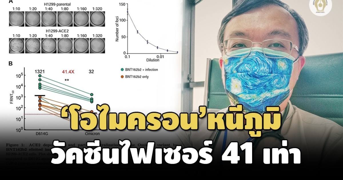 'หมอธีระ'ยกงานวิจัยจากแอฟริกาใต้ ชี้โควิดสายพันธุ์โอไมครอน หนีภูมิคุ้มกันจากวัคซีนไฟเซอร์ 41 เท่า แต่ในกลุ่มคนเคยป่วยโควิดแล้วได้รับวัคซีนไฟเซอร์ ยังจัดการเชื้อกลายพันธุ์ใหม่นี้ได้